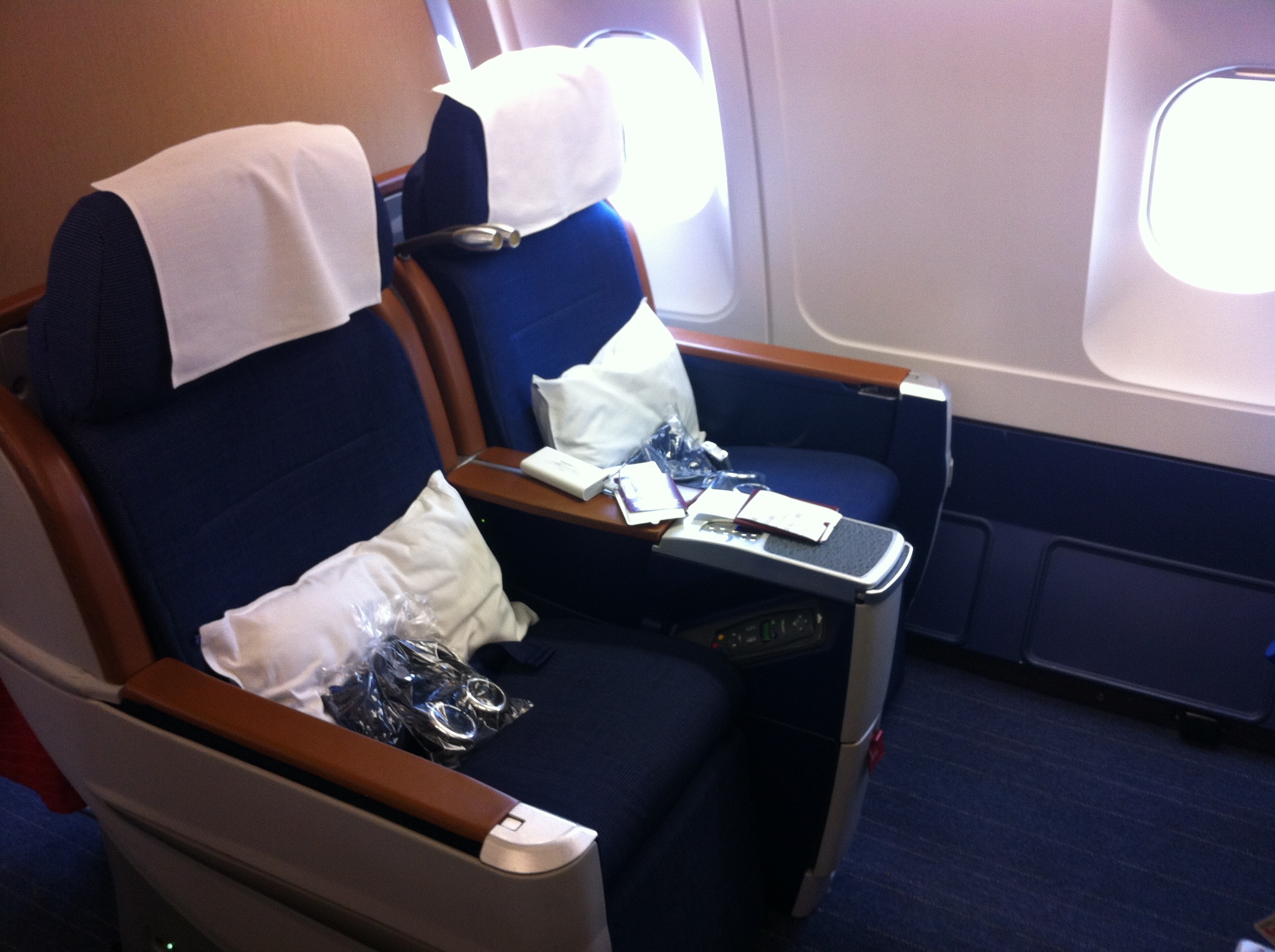 Boarding odbywał się dwoma rękawami (jet-bridge). Po wejściu na pokład z zaskoczeniem odnotowaliśmy fakt, że personel nas nie powitał… Szybko odnaleźliśmy nasze miejsca 2A i B, zapakowaliśmy bagaże podręczne do przepastnych schowków nad głowami i rozsiedliśmy się w wygodnych fotelach.
