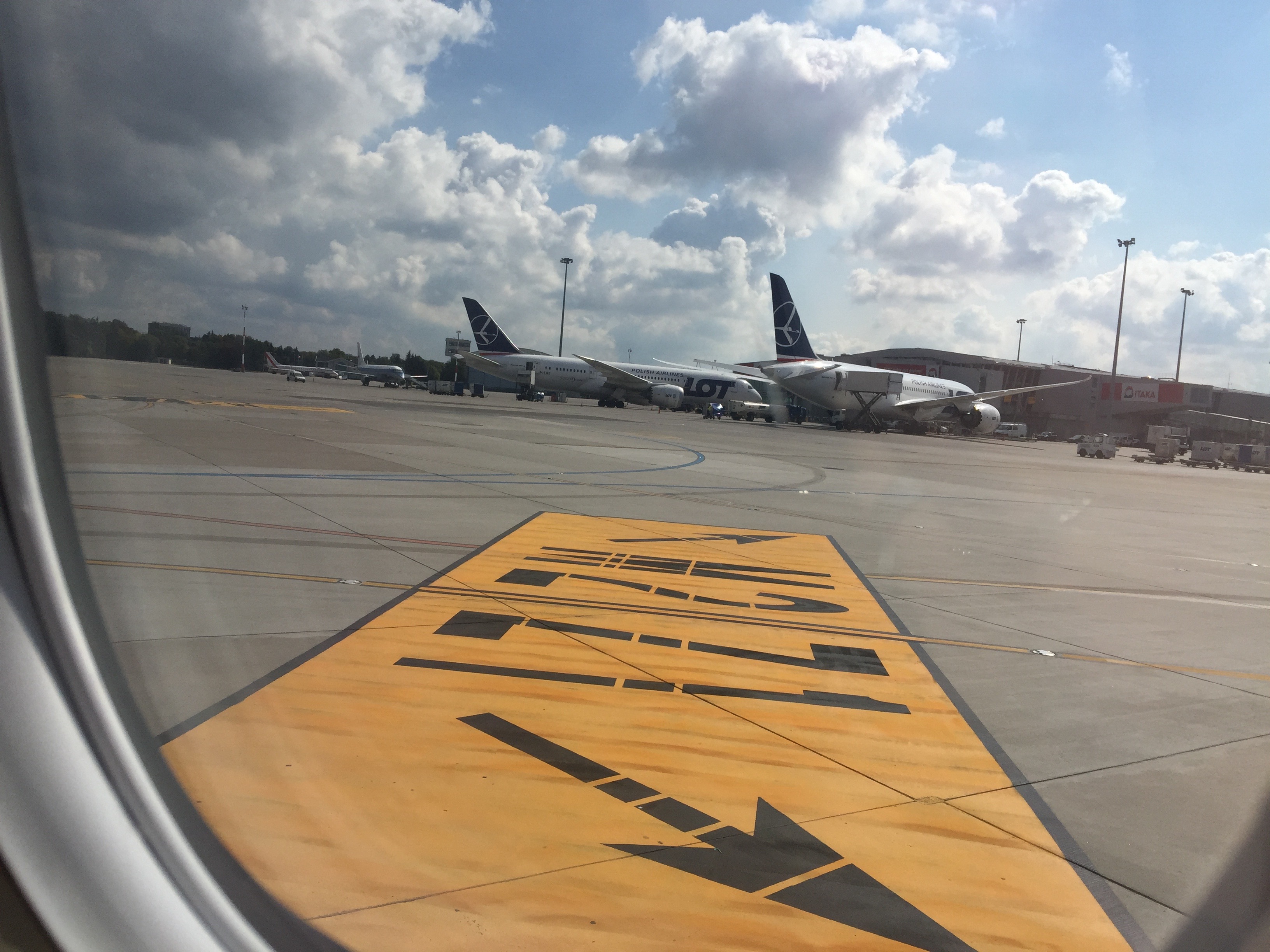Po ok. godzinnym rejsie wylądowaliśmy na lotnisku im. F.Chopina w Warszawie. Kołując na stanowisko postojowe mijaliśmy 2 Dreamliner’y LOTu szykowane do startów. Jednym z nich wkrótce mieliśmy polecieć po raz pierwszy.