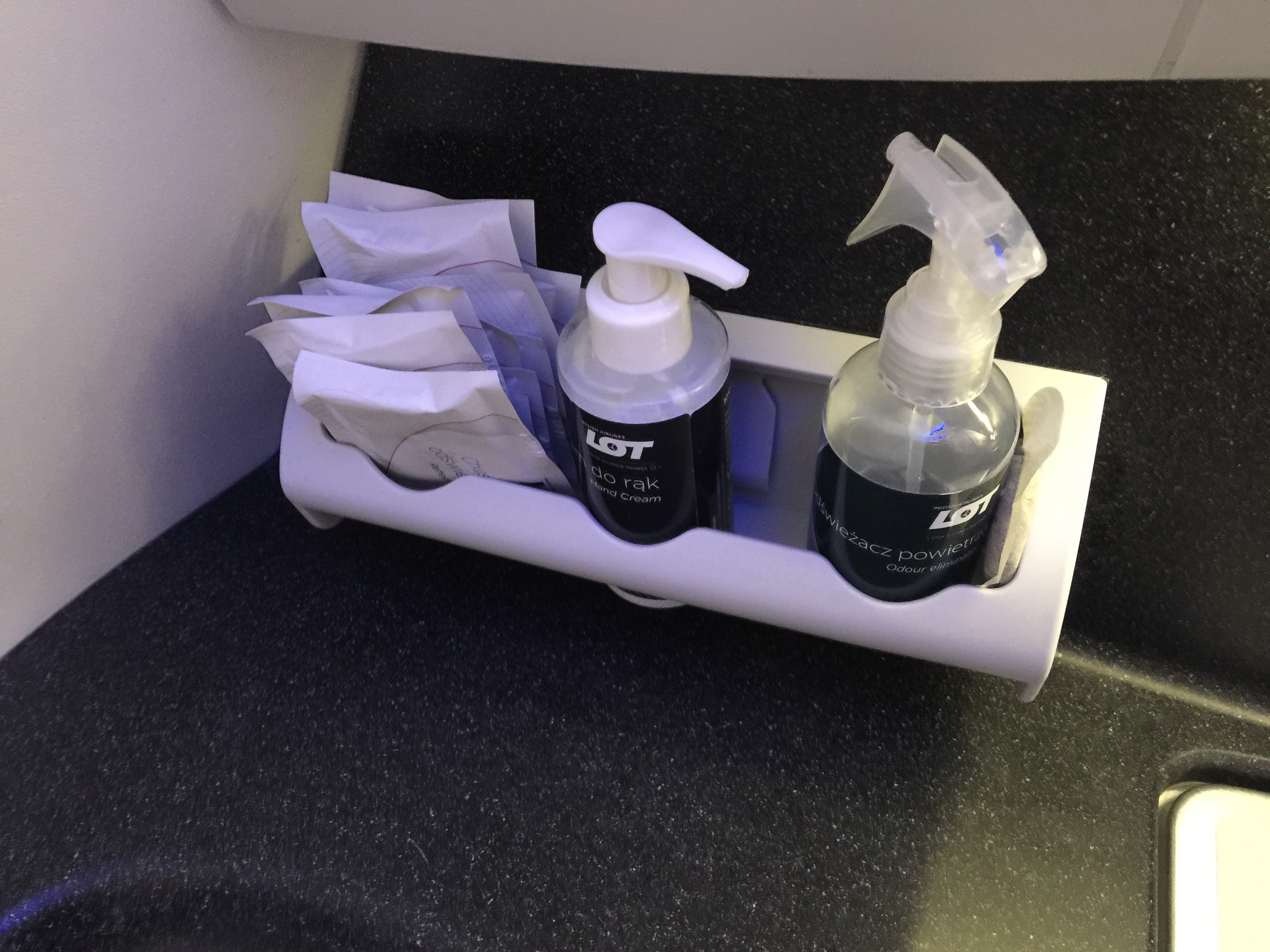 Toalety w klasie biznes nie różnią się zbytnio od tych w klasie ekonomicznej, poza kwiatkiem oraz dodatkowymi kosmetykami.