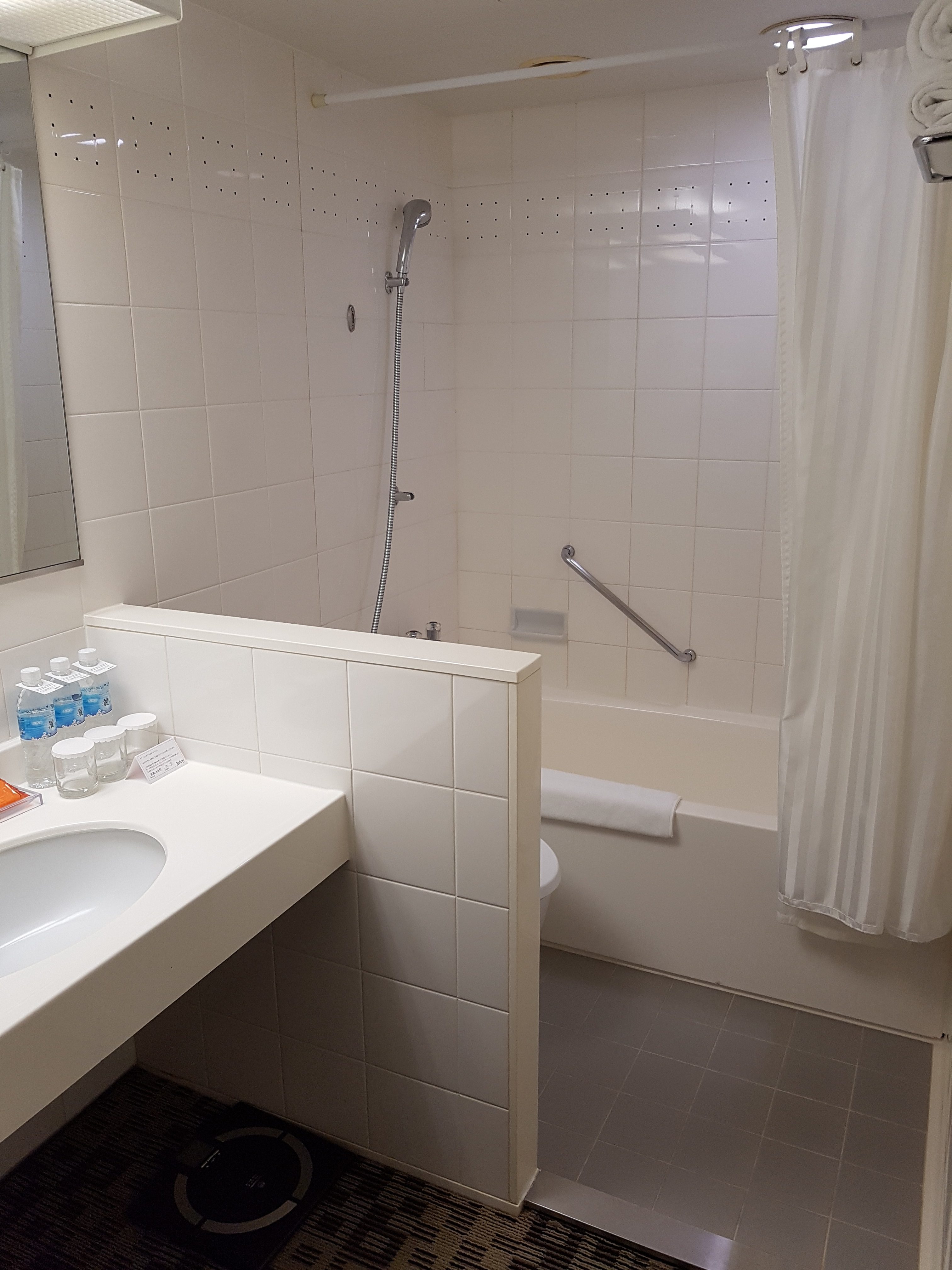 Łazienka, podzielona jest na trzy części funkcjonalne. W pierwszej znajduje się umywalka z lustrem. Druga część to toaleta z typowymi dla Japonii udogodnieniami, trzecia zaś, z własną zasłonką to wanna wraz z prysznicem. Łazienka wyposażona była oczywiście w pełen zestaw kosmetyków i akcesoriów jak również urządzenia typowe w hotelu tej klasy – np. suszarka.