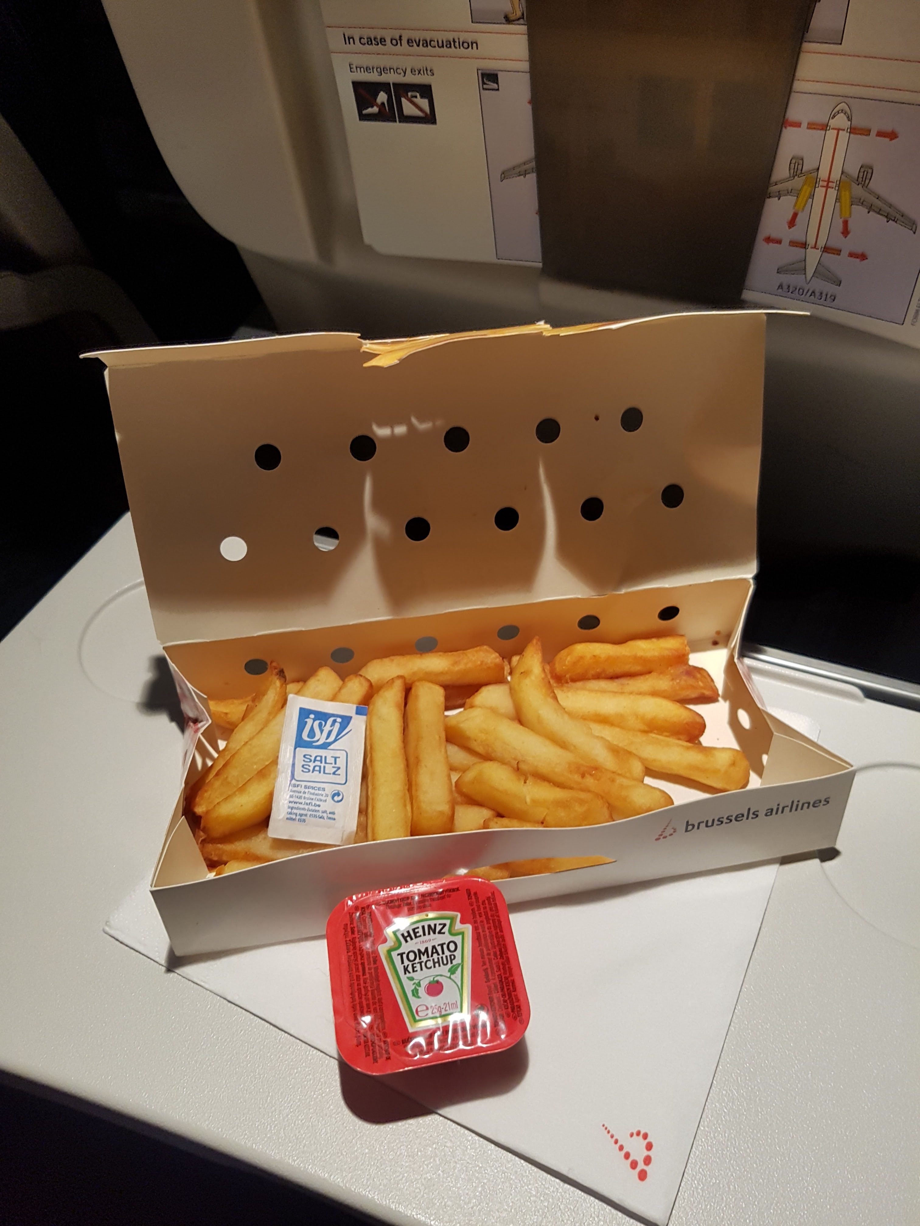 P.S. W trakcie lotu powrotnego z Brukseli do Warszawy dowiedzieliśmy się od załogi, że w przypadku wieczornych lotów (po godzinie 20.00), które nie wracają tego samego dnia do Brukseli często zdarzają się przeceny na ofertę świeżych potraw. Linia lotnicza wychodzi z założenia, że lepiej wyprzedać z 50% rabatem świeże produkty niż je wyrzucić, gdyż następnego dnia nie będą przydatne do spożycia. W ten sposób skorzystaliśmy z oferty i spróbowaliśmy kanapkę i frytki. Porcja frytek była mała i zdecydowanie nie równała się z tradycyjnymi belgijskimi frytkami, do których Bruksela zdążyła nas już przyzwyczaić. Smakowały jak wyglądały. Z kolei kanapka była dość sucha i tu konkurencję zdecydowanie wygrywa LOT, który serwuje na pokładzie bardzo smaczne kanapki w znacznie niższej cenie (porównujemy ceny z menu, bez obniżki). Odpłatny serwis pokładowy w LOT opisaliśmy przy okazji podróży do Kiszyniowa.