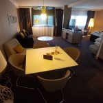 Pokój 6210 okazuje się być apartamentem ze świetnym widokiem na terminal lotniska. Pokój jest duży, podzielony wyspą z obrotowym telewizorem i minibarem na część dzienną i sypialnię. W części dziennej do dyspozycji mamy stół z 4 krzesłami, rozkładaną, dużą kanapę, stolik kawowy, fotel oraz szafkę-wyspę z minibarem. Część sypialna to duże, wygodne, bardzo miękkie łóżko typu king, szafki nocne z gniazdkami elektrycznymi, fotel oraz otomana. Całość uzupełnia wielki telewizor, który w miarę potrzeb można obracać tak, aby oglądać go w sypialni bądź pokoju dziennym.