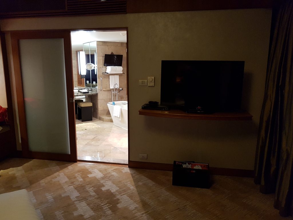 Pokój 3112, znajduje na jednym z najwyższych pięter hotel. Po wejściu do pokoju, po prawej stronie mamy szafę z miejscem na ułożenie walizki, po prawej zaś przestronną łazienkę z wolnostojącą wanną, prysznicem, oraz umywalką i toaletą. Łazienka oddzielona jest od pokoju szklaną ścianą, a prywatność korzystania z niej zapewnia elektrycznie przesuwana kotara. Wszelkie możliwe kosmetyki oraz przybory toaletowe, klasycznie, jak w przypadku wszystkich hoteli tej marki, ułożone są na blacie przy umywalce. Ciekawostką jest fakt, iż otrzymaliśmy dodatkowy komplet kosmetyków „limited edition”, zamówionych przed przyjazdem w aplikacji Conrad na smartfona. Kompletu wyposażenia łazienki dopełnia świetna suszarka do włosów.