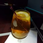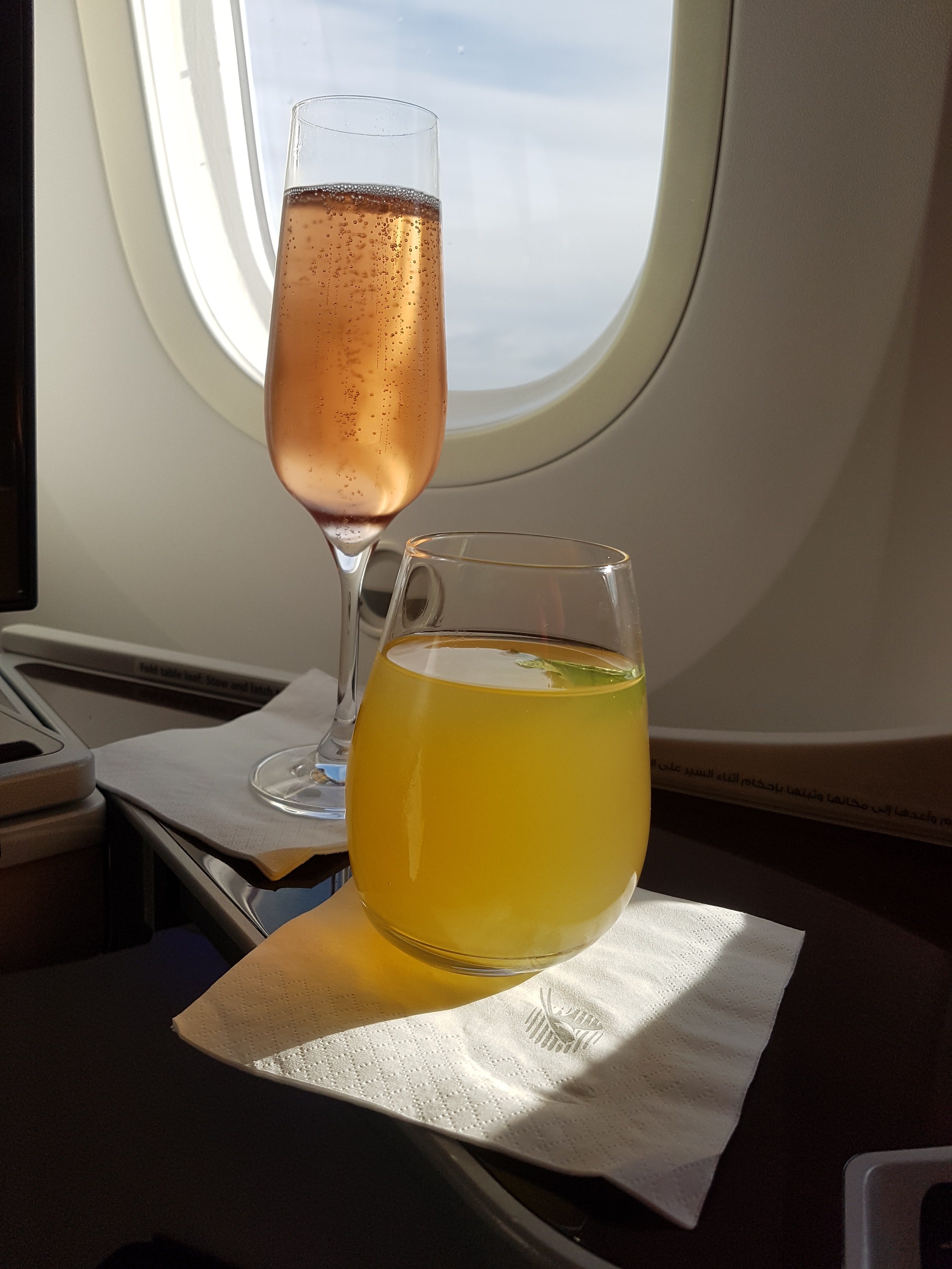 Przemiła załoga powitała nas na pokładzie i zostaliśmy zaprowadzeni do naszych miejsc. Zajmujemy fotele pojedyncze po obu stronach samolotu (2Ai 2K). Jak się okazało, w Dreamlinerze Qataru w klasie biznes schowki bagażowe znajdują się tylko nad pojedynczymi siedzeniami przy oknach. Oznacza to, że w skrajnych przypadkach może być kłopot ze znalezieniem wolnego miejsca. Steward pomógł nam zrobić małe przemeblowanie w schowkach i po chwili zajęliśmy miejsca w oczekiwaniu na drinki powitalne. Zamówiliśmy dwa rodzaje szampana (w tym rzadko spotykanego szampana rose) oraz sok ze świeżo wyciskanej limonki z miętą.