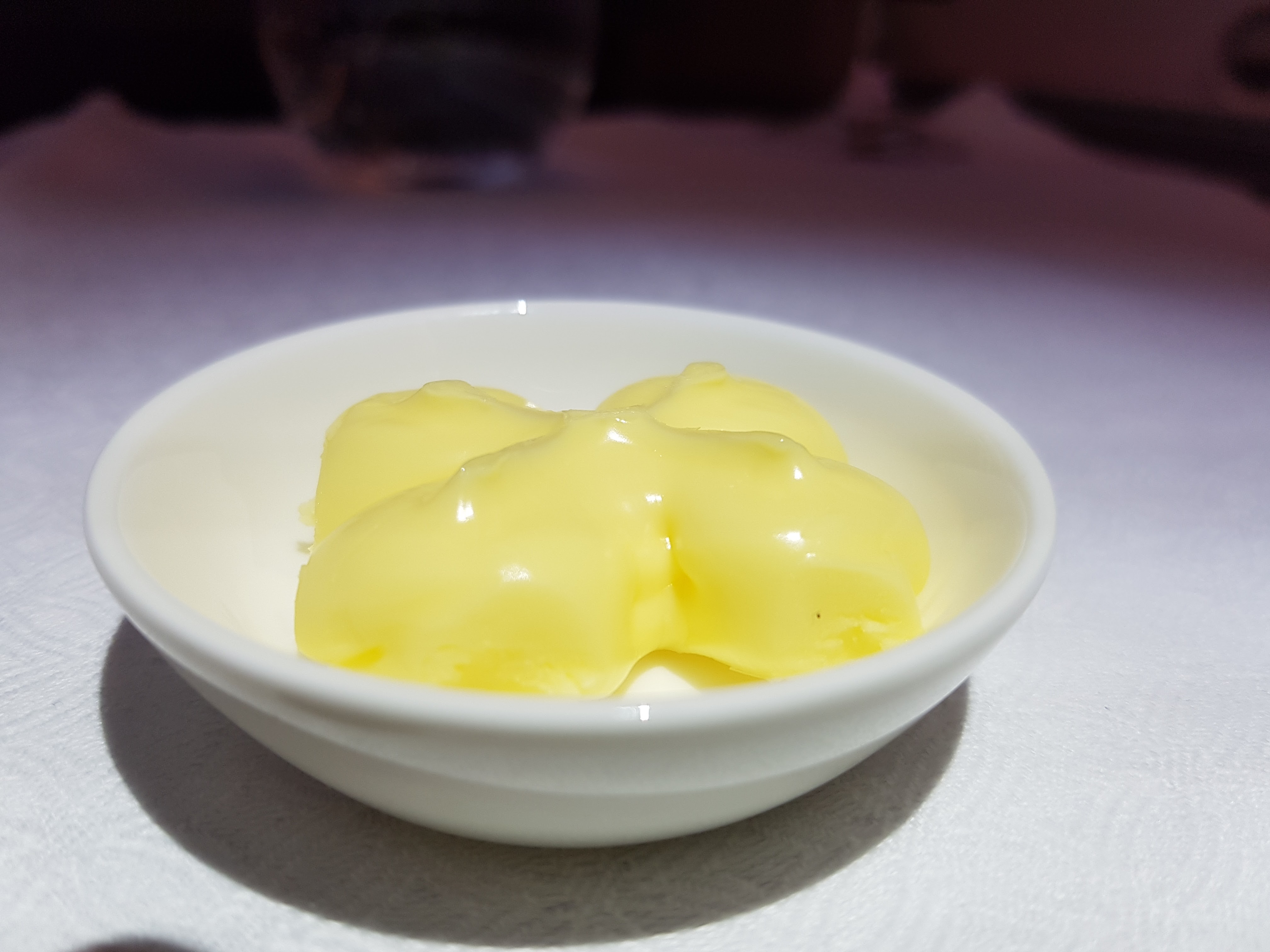 Na pierwszym rejsie poprosiliśmy o serwis dwie godziny po starcie. Punktualnie o godzinie 12.20 pojawiła się Stewardessa i przygotowała stolik do serwisu. Rozłożyła obrus, podała szklankę na wodę mineralną, naczynie z pieczywem, talerzyk i nożyk do pieczywa, masło, sól i pieprz.