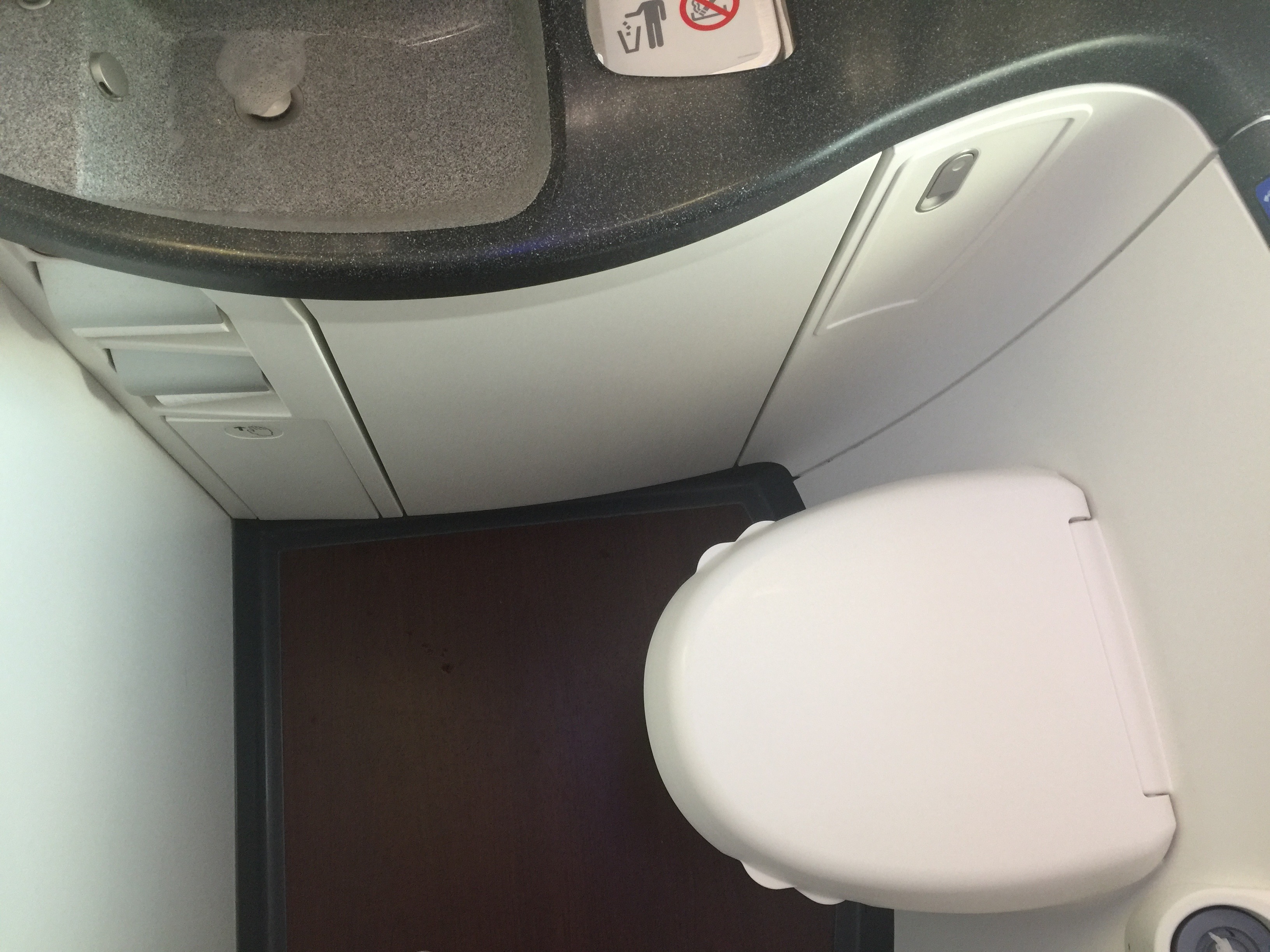 Dwie toalety w klasie biznes są dość wygodne, większe niż w klasie ekonomicznej i każda z nich posiada okno. Znajdziemy w nich podstawowe przybory kosmetyczne czyli mydło i balsam do rąk oraz perfumy, a po starcie załoga uzupełniła je o szczoteczki do zębów i zestawy do golenia.