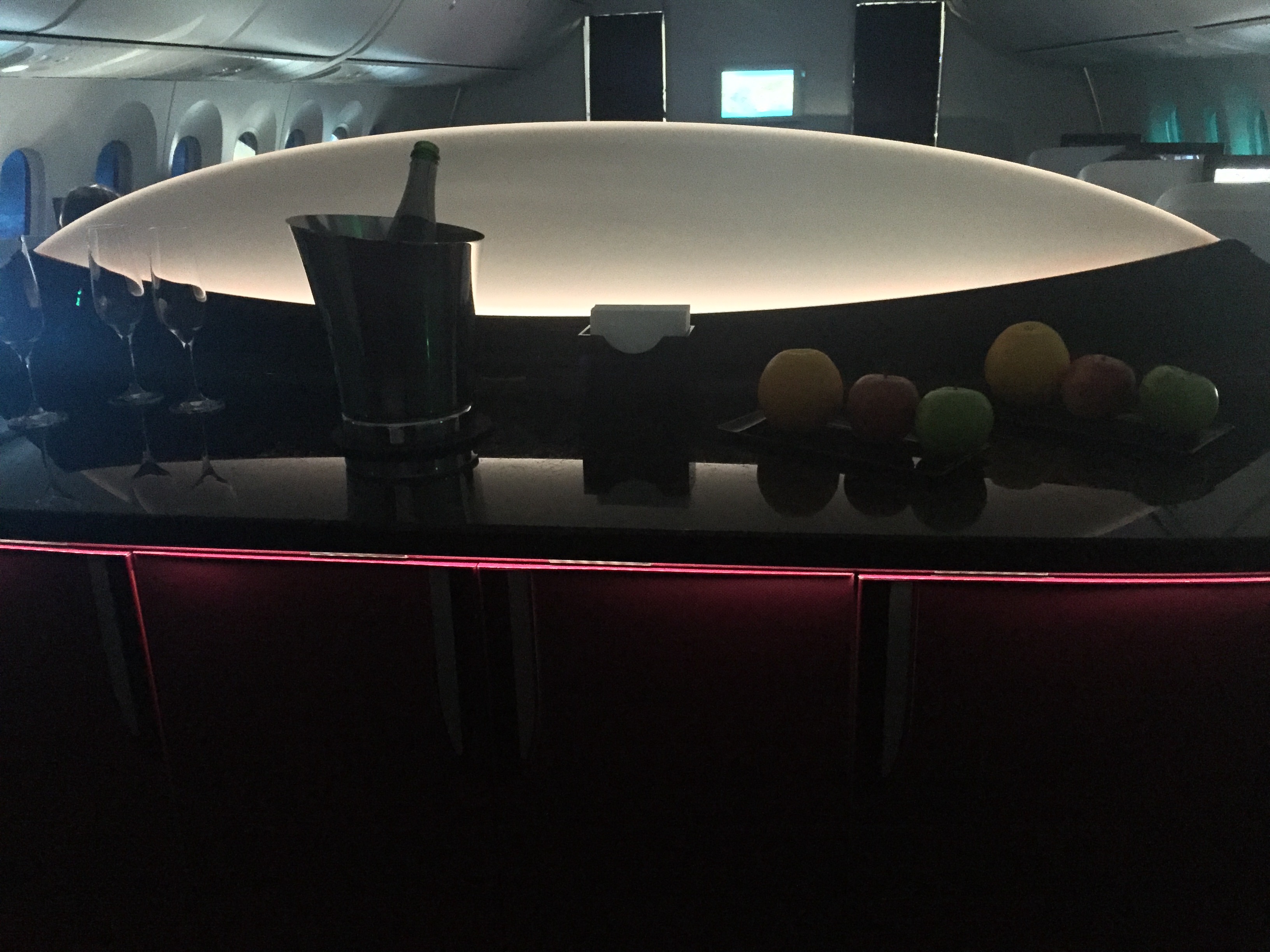 Chwilę po starcie załoga otworzyła mini lounge i delikatnie przyciemniła kabinę. To co ogromnie lubię w Dreamlinerze to okna – są bardzo duże i nie posiadają rolet. Można ręcznie sterować poziomem ich zaciemnienia (chyba, że załoga centralnie zablokuje taką możliwość, co czasami ma miejsce, szczególnie na nocnych lotach).