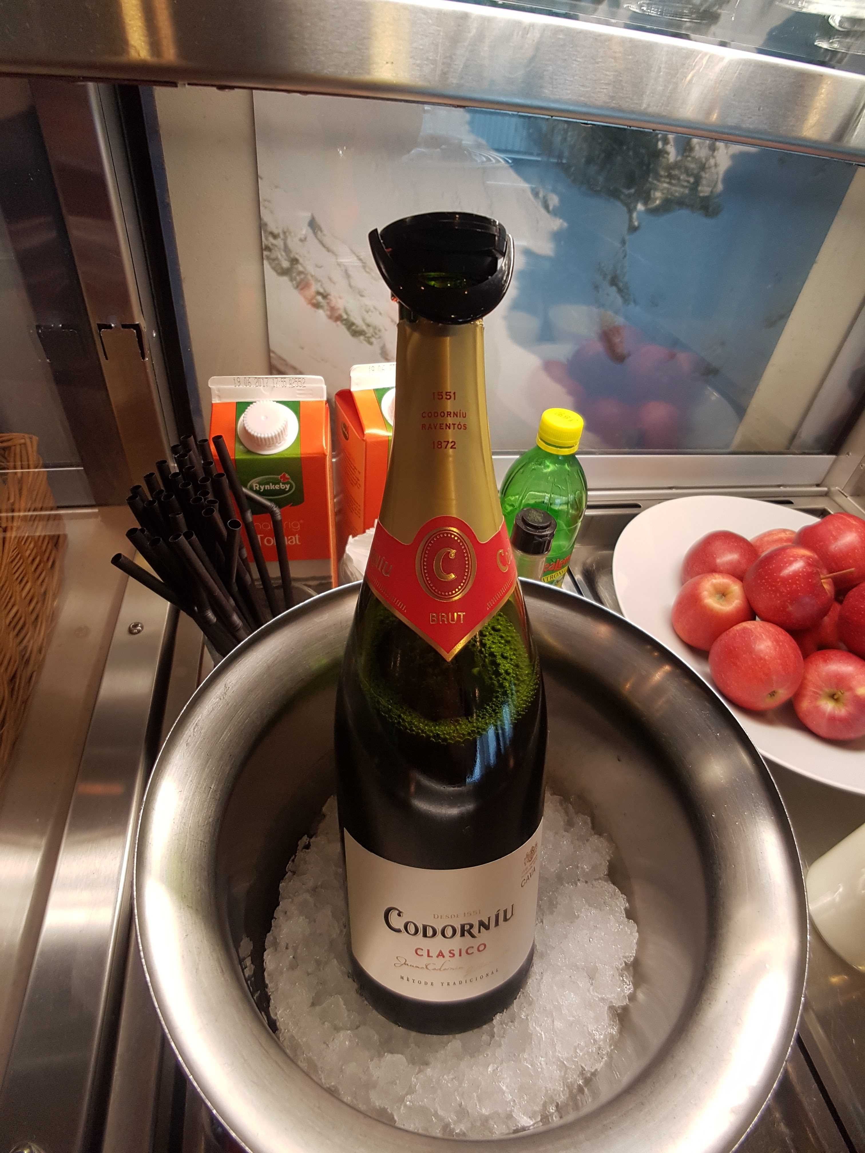 W godzinach porannych w lounge serwowane było śniadanie z goframi na ciepło, jogurtem, muesli, smoothie, wyborem pieczywa, wędlin, serów i warzyw, a także jajka. Na stolikach znaleźć można było również owoce – głównie jabłka i pomarańcze, ale także ciastka i chipsy i inne przekąski. Dostępne w saloniku napoje ciepłe (kawy, herbaty, czekolada), zimne (ze stajni Pepsi, z kija), soki (jabłkowy, pomarańczowy, pomidorowy) oraz wyskokowe – wino białe, czerwone i musujące (cava).