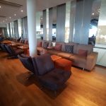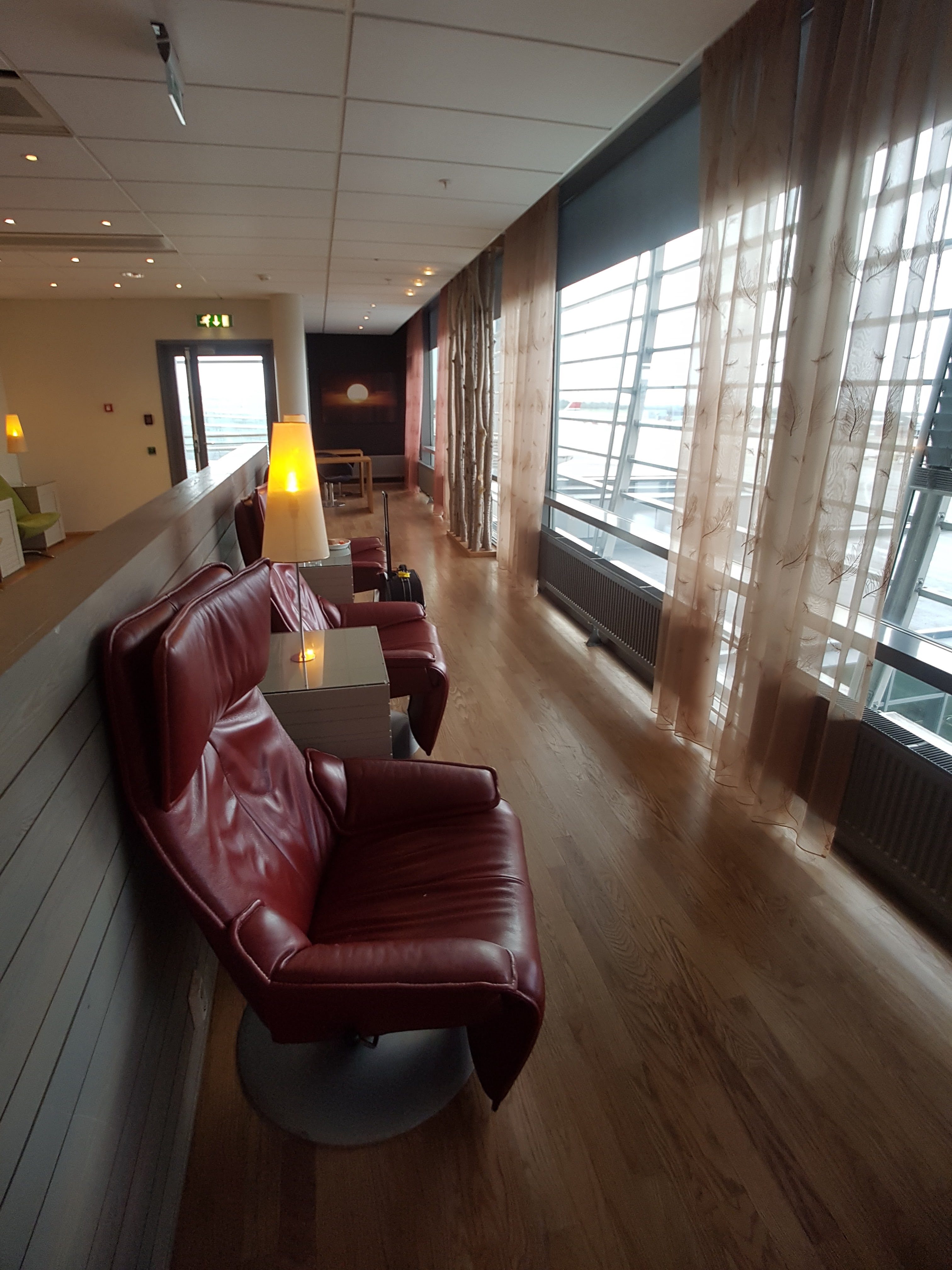 Lounge odwiedzamy w godzinach rannych. Sam salonik nie jest może nadmiernie duży, ale w czasie naszego pobytu nie był zatłoczony. Salonik urządzony jest w ciepłym, skandynawskim stylu – dużo drewna, wygodne, głębokie fotele. Oferuje częściowy podgląd na płytę postojową lotniska, a także widok na elementy terminala zarówno od strony wewnętrznej (airside), jak i zewnętrznej.