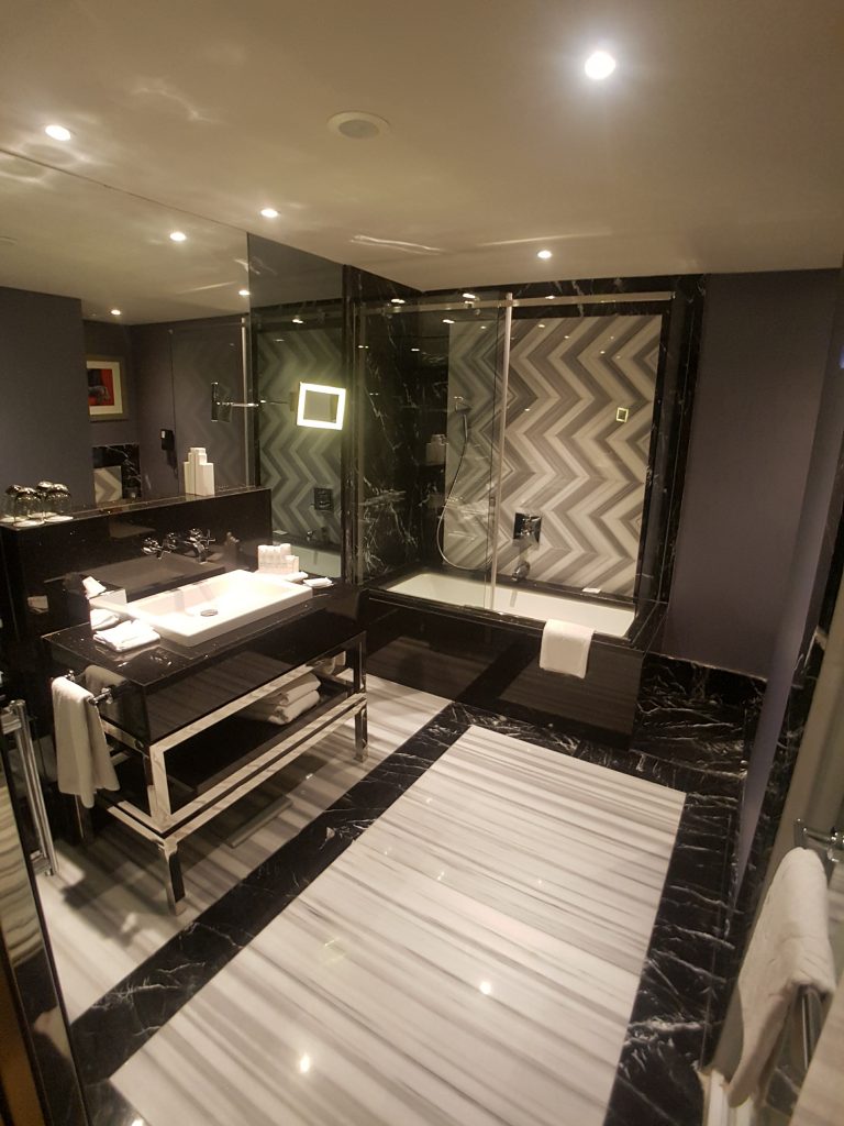 Łazienka w całości zabudowana w kamieniu oferuje wszystko czego mógłby zapragnąć gość. Jest więc wygodna wanna z prysznicem, choć w łazience znajdziemy też osobną kabinę prysznicową. Jest piękne lustro nad umywalką, z dodatkowym lusterkiem powiększającym. Jest oczywiście umywalka z przestrzenią blatu na kosmetyki i inne akcesoria. Kosmetyki oraz akcesoria toaletowe (szczoteczki, grzebień, zestaw do golenia) są przygotowane i na swoim miejscu. Jest też oczywiście toaleta. Małym mankamentem, który zresztą hotel zauważył, jest fakt, że kamienna podłoga pod prysznicem w połączeniu z wodą staje się dość śliska. Jako środek zaradczy zastosowano system wzywania pomocy (długi do podłogi „sznurek”, którego pociągnięcie wzywa do pokoju pomoc). Jeśli ktoś na takim podłożu będzie czuł się niepewnie, można oczywiście zastosować prostszy, „domowy sposób” na zaradzenie mu – czyli rzucenie na podłogę pod prysznicem małego ręcznika.