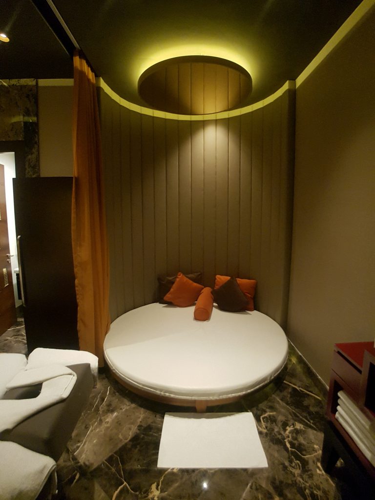 Wracając do fotela – zastanowiły nas w nim na pierwszy rzut oka dwie rzeczy – po pierwsze wystające z niego kable. Po drugie, przy bliższej obdukcji okazało się, że w zwieńczeniu oparcia, części po bokach są w dziwny sposób fantazyjnie podziurkowane. Co się okazało? Otóż fotel rozkładający się do pozycji niemal szezląga ma wbudowane w zagłówek głośniki – można za pomocą gniazda jack (stąd wystające kable) podłączyć go do swoich urządzeń i słuchać na nim muzyki. Ciekawe i rzadko spotykane rozwiązanie, odróżniające ten hotel od innych (w pokoju klasy biznes taki fotel również się znajdował).