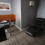 Prostokątny salon był podzielony optycznie na część biurową z biurkiem, krzesłem i szezlongiem oraz wypoczynkową z kanapą, fotelami, stolikiem kawowym oraz minimum 50” telewizorem. Wzdłuż dłuższej ściany umiejscowione były duże okna, dzięki czemu pokój był dobrze doświetlony. Absolutnym plusem tego niewątpliwie wygodnego pokoju jest fakt, że posiadał widok na Gendarmenmarkt i Katedrę niemiecka. Warto również wspomnieć, że w salonie znajdował się minibar, którego zawartość była ujęta w cenie apartamentu.