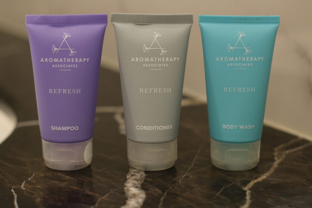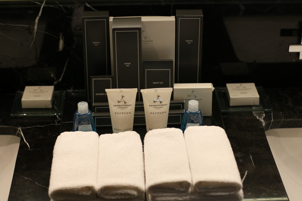Apartament posiada osobną toaletę, zlokalizowaną przy wejściu do pokoju, oraz dużą, główną łazienkę, do której wejść możemy z sypialni. W łazience, oprócz toalety, dwóch umywalek i wielkiego lustra z wbudowanym weń telewizorem, znajdziemy osobne, bo oddzielone przeszklonymi drzwiami pomieszczenie kąpielowe z wielką, wygodną wanną oraz prysznicem oferującym niezliczoną ilość kombinacji strumieni wody z wszystkich możliwych kierunków. Na osobną wzmiankę zasługują kosmetyki, które możemy zamówić według naszego uznania i preferencji – przetestowaliśmy te marki Tara Smith oraz Shanghai Tang i jak można było się spodziewać – były świetne.