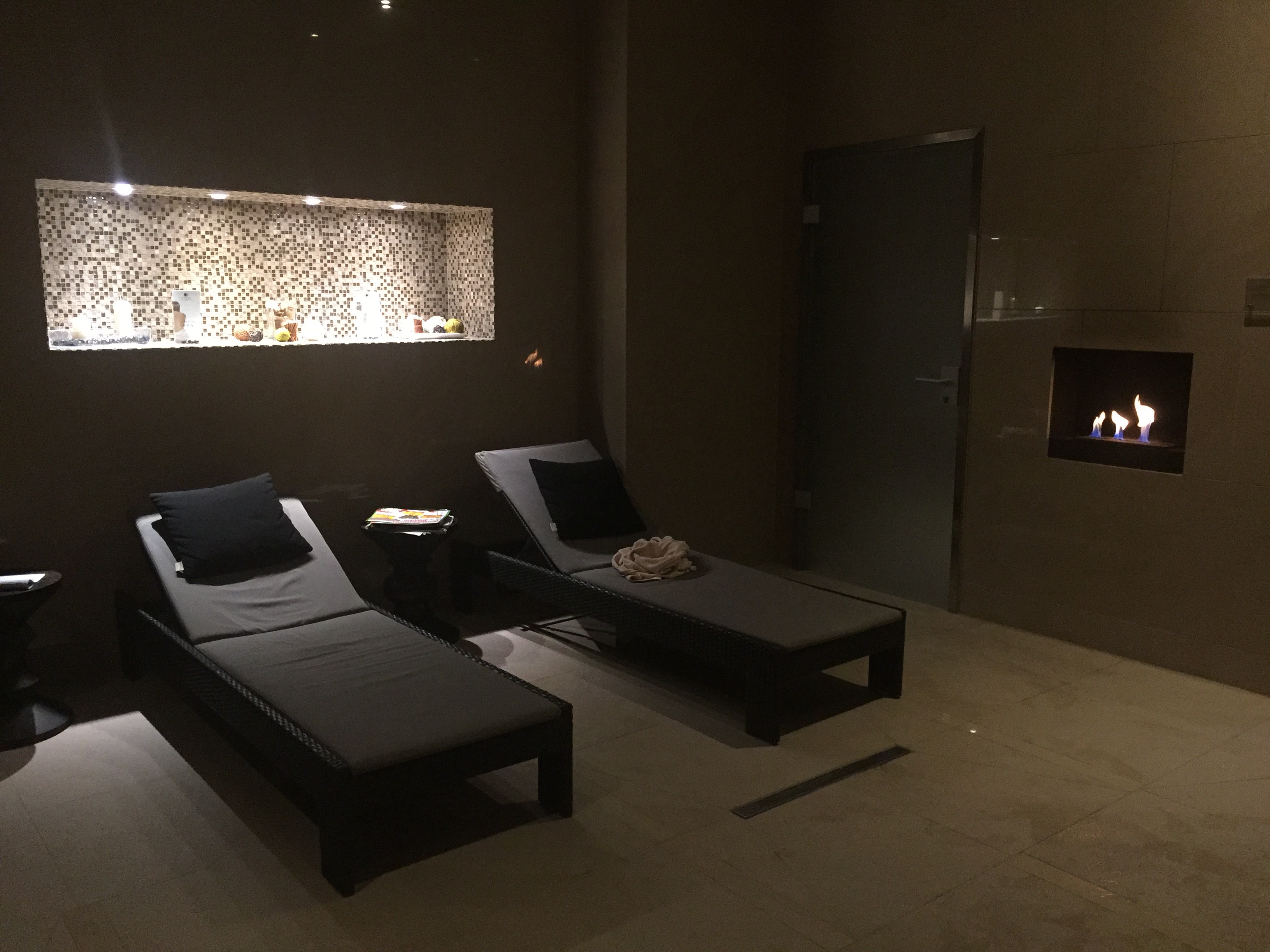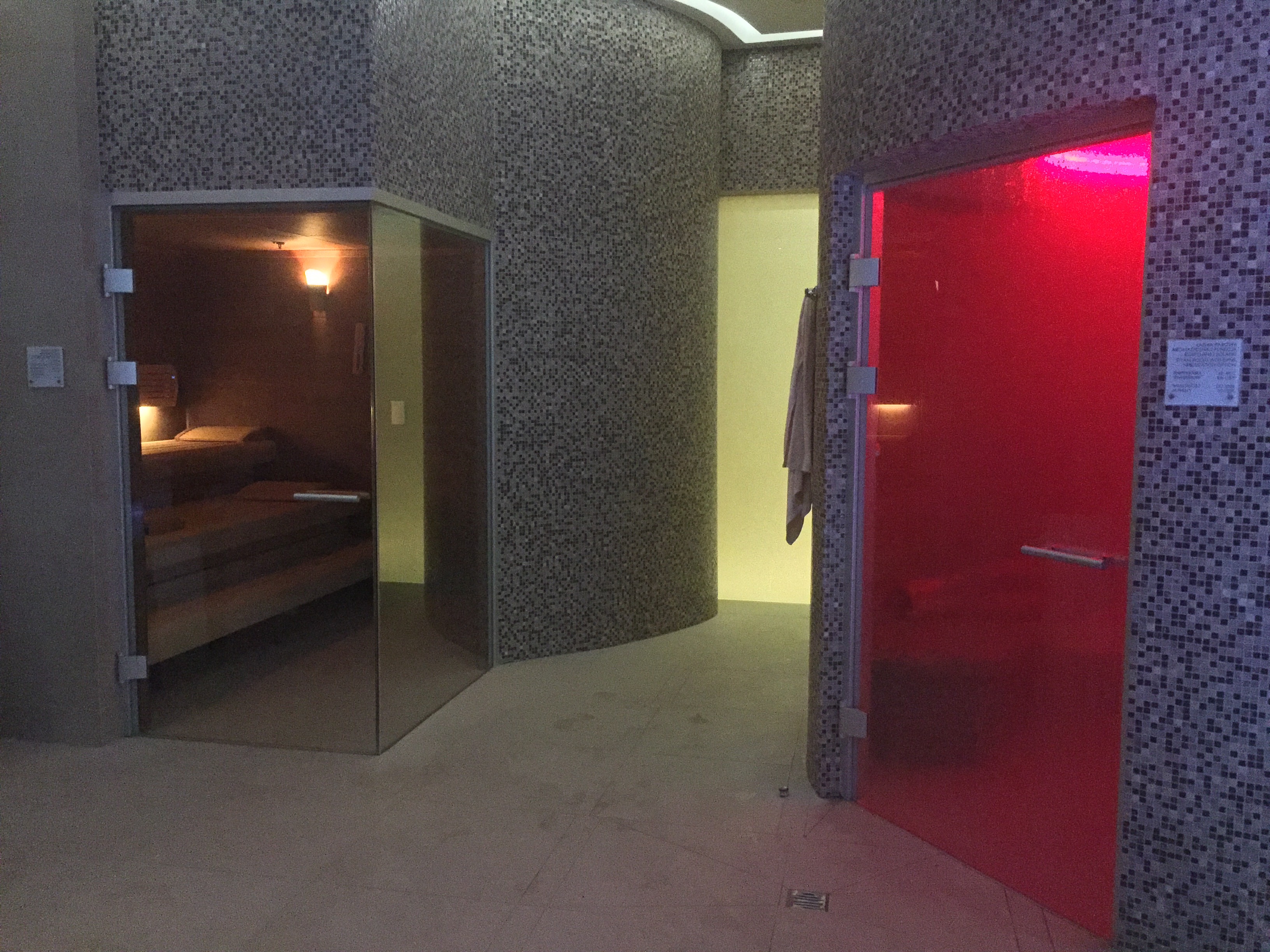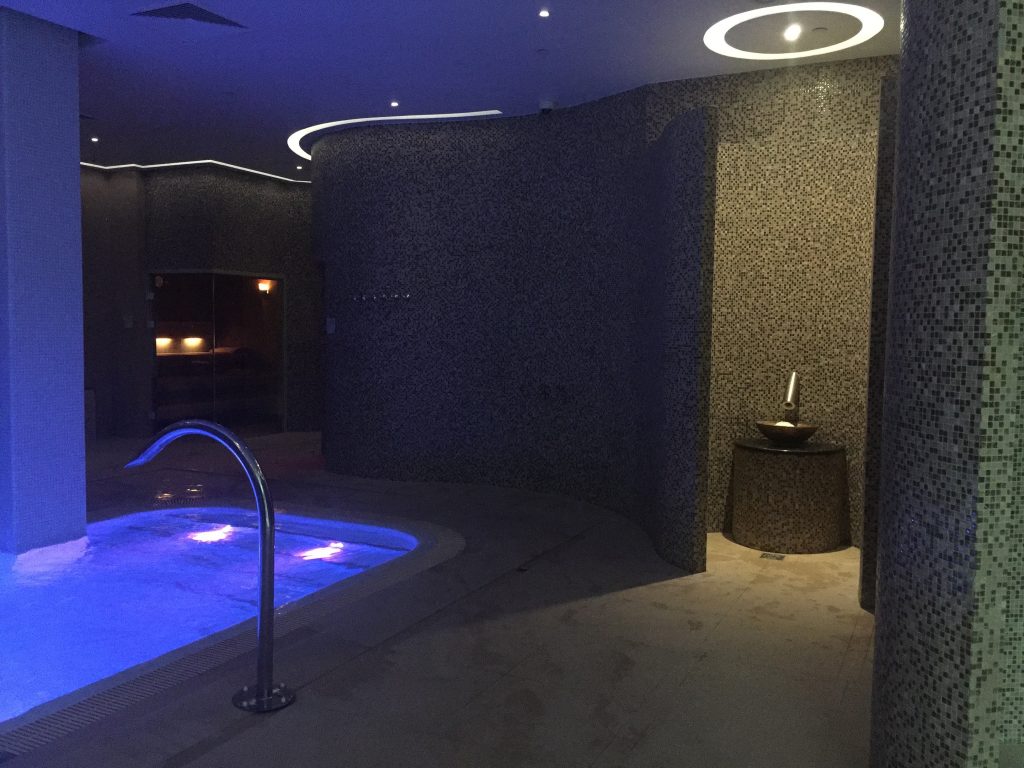 Z głównego pomieszczenia można przejść do tak zwanego hammam zone – jednak nie jest to coś, czego byście się tam spodziewali. To oddzielne, mniejsze pomieszczenie, w którym znajduje się sanarium (sauna fińska z mniejsza temperaturą), 3 leżaki oraz oddzielny pokój do masażu oraz zabiegów z wykorzystaniem hydromasażów. Tu również był kiedyś mini bar z wodą.