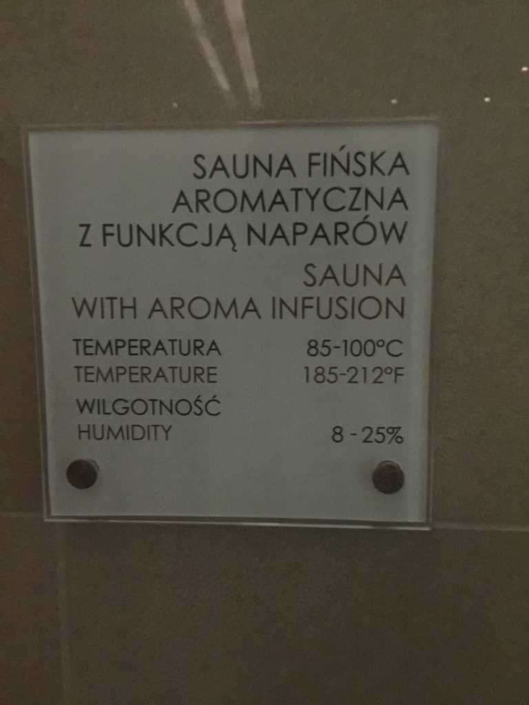 Do końca naszego pobytu w strefie, przez ponad 2 godziny, nikt nie uzupełnił napojów ani nie doniósł szklanek. W międzyczasie obsługa kilkukrotnie przynosiła ręczniki. W rogu pomieszczenia, przy wejściu do sauny fińskiej znajdował się działający dystrybutor z wodą i plastikowymi kubkami. Na przeciwko sauny fińskiej znajdowała się sauna parowa.