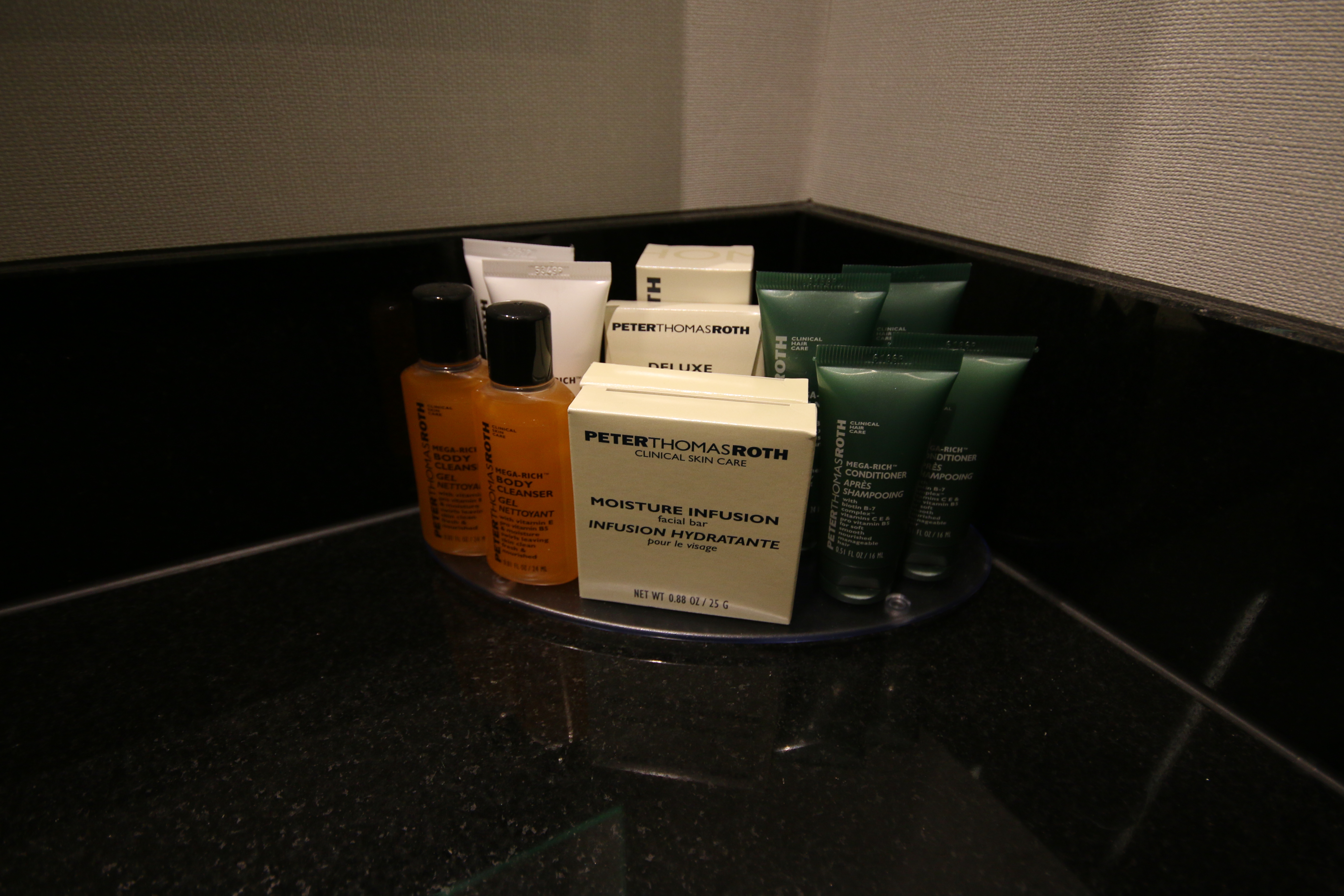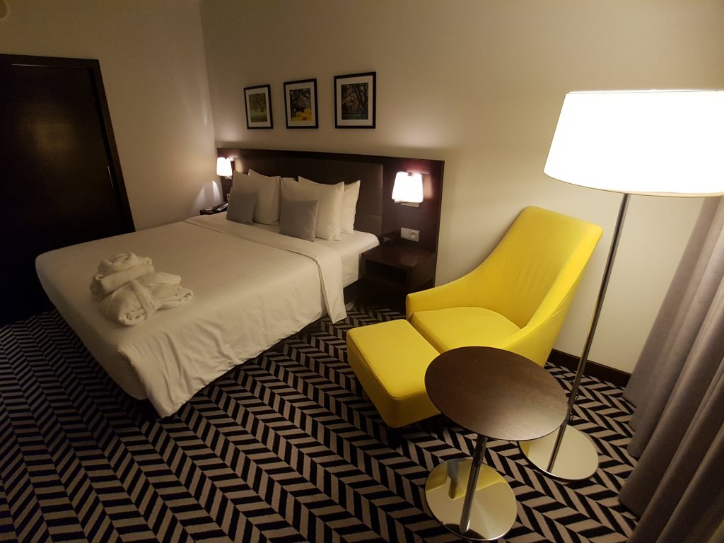 Na pierwszy rzut oka pokój bardzo wygodny. Miłe pluszowe kanapy i fotele oraz niesamowicie wygodne łóżko Dreams® by Serta, którym chwali się sieć Hilton, dominują kolorystycznie. Duże okna, od podłogi do sufitu, idealnie tłumią hałas dobiegający z zewnątrz. Nie słychać pociągów, samolotów, samochodów, dosłownie nic. Idealne warunki do zrelaksowania się lub odespania po męczącej podróży. Łazienka z toaletą i prysznicem nie jest zbyt duża, ale bardzo dobrze zaaranżowana. Znajdziemy w niej standardowe Hiltonowskie kosmetyki marki Peter Thomas Roth.