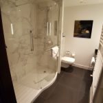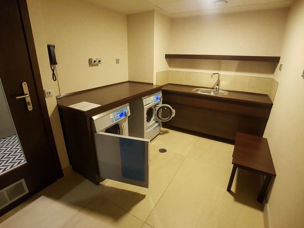 Nasz pokój nr 417 o powierzchni około 50 mkw mieścił się naczwartym – ostatnim –piętrze, z widokiem na tory kolejki miejskiej łączącej lotnisko ze stacją Kraków Główny (cena biletu w 1 stronę 9 zł) i z Wieliczką (cena biletu 12,50 zł). Składał się on z sypialni, łazienki z prysznicem i toaletą, salonu z dodatkową rozkładaną sofą i aneksem kuchennym oraz dodatkową toaletą. W obu pomieszczeniach znajdziemy 42-calowe telewizory.