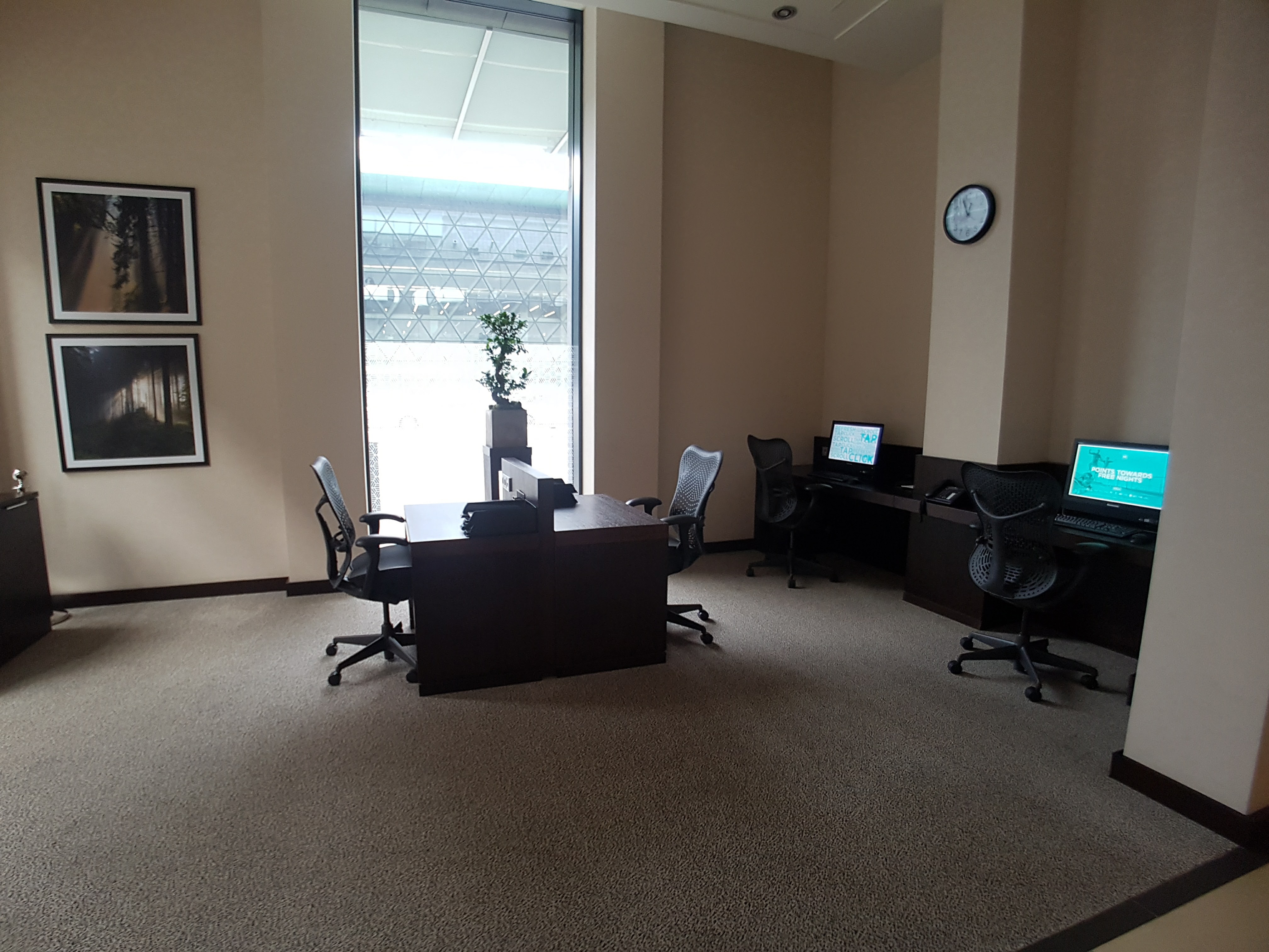 Przy samej recepcji usytuowano tablice odlotów a także mini-bufet z kawą i herbatą na wynos. Na szczególną uwagę zasługuje sklepik umiejscowiony przy recepcji, oferujący różne artykuły, które może potrzebować podróżny: jedzenie, napoje, przekąski, alkohol, produkty regionalne, kosmetyki, leki. Dodatkowo, w sklepiku dostępne są do użytku gości kuchenki mikrofalowe, w których można przygotować sobie zakupione produkty.