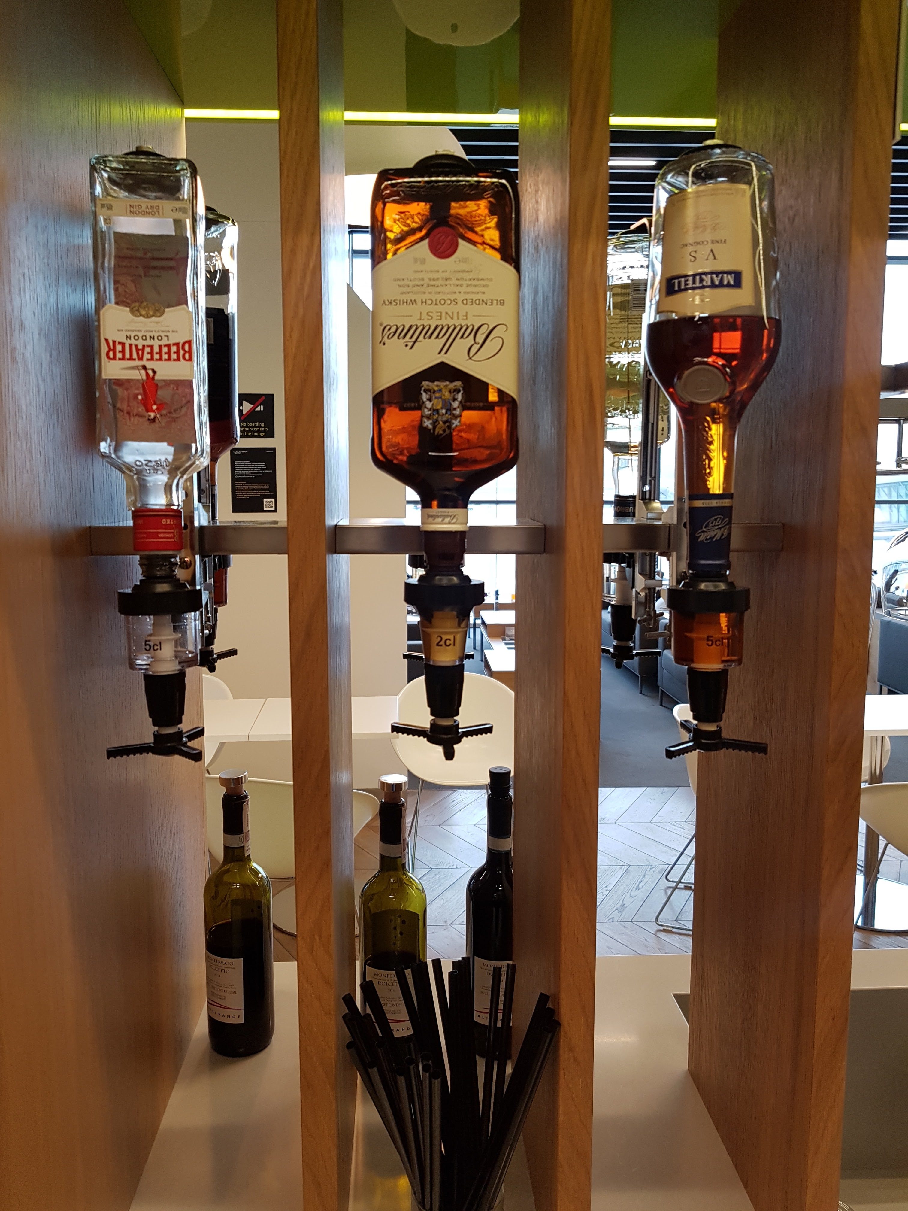 Po sprawdzeniu kart pokładowych i statusu w programie lojalnościowym w recepcji, zapraszani jesteśmy do środka. Wnętrze saloniku jest jasne, na co wpływ ma zapewne ściana okien z widokiem na płytę lotniska vis-a-vis wejścia. Uwagę przykuwają też kolory, w szczególności ostro limonkowa konstrukcja barów po prawej stronie pomieszczenia.