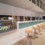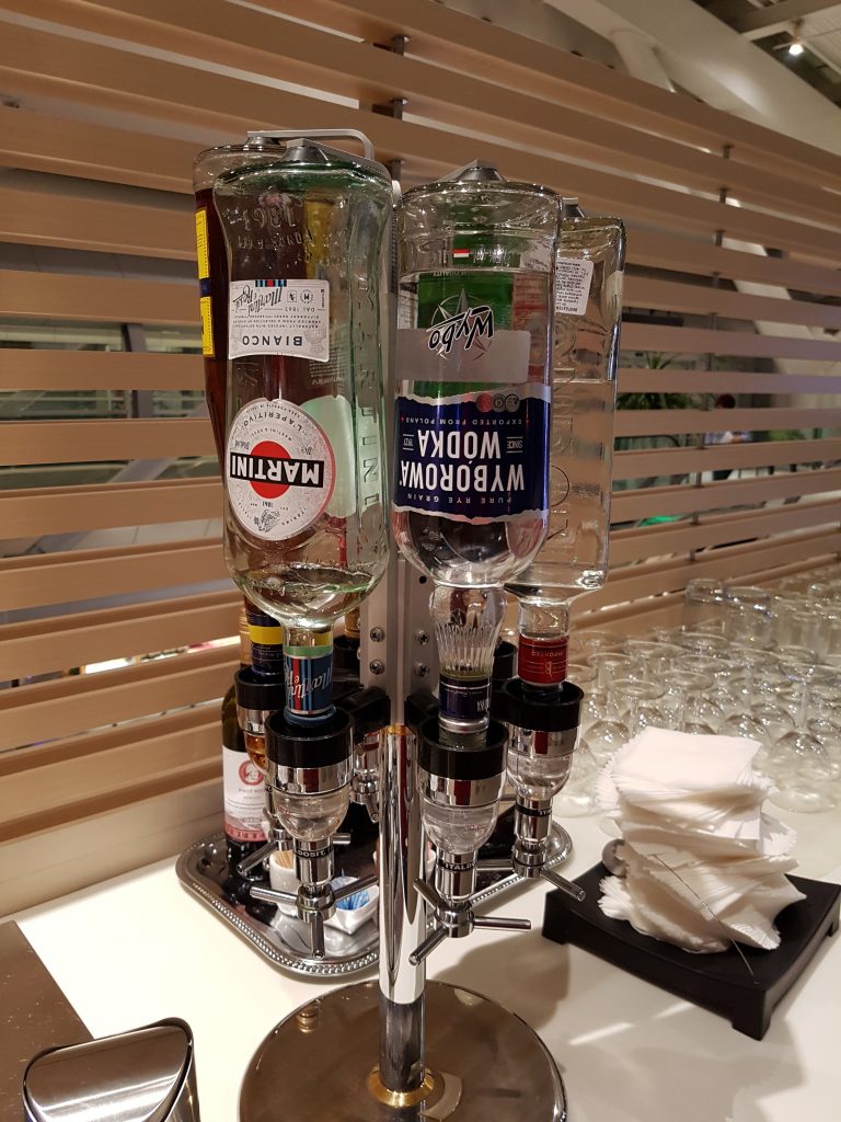 Po prawej stronie od wejścia znajduje się strefa bufetowa, z długim bufetem po jednej i barem po drugiej stronie. Bar, mimo swojej wielkości (długości) jest dziwny, bo niewiele w nim jest – trochę przetworów mlecznych (sic!, mleko, jogurty, itp), oraz bardziej dekoracyjna niż użytkowa wystawka alkoholi. Zresztą, nie lepiej prezentuje się bufet po drugiej stronie, którego oferta jest nad wyraz skromna. Jest ekspres do kawy, herbata, kilka rodzajów soków. Są podstawowe alkohole, białe i czerwone win, kilka słonych i słodkich przekąsek (chipsy, wafelki, ciastka). Jest też lodówka z napojami gazowanymi oraz piwem, oraz lodówki, ze wspomnianymi wcześniej, jogurtami, mlekiem i innymi podobnymi przetworami mlecznymi. Ogólnie rzecz ujmując – dość skromnie.
