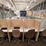 Dalej zaczyna się strefa, którą można by nazwać wypoczynkową, z fotelami, krzesłami, kanapami i ławkami w różnych konfiguracjach. Są też stoliki, oraz boksy do pracy, z których dwa wyposażone są w laptopy. W saloniku poustawiane są stacje ładowania brandowane przez operatora kart kredytowych – firmę VISA.