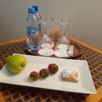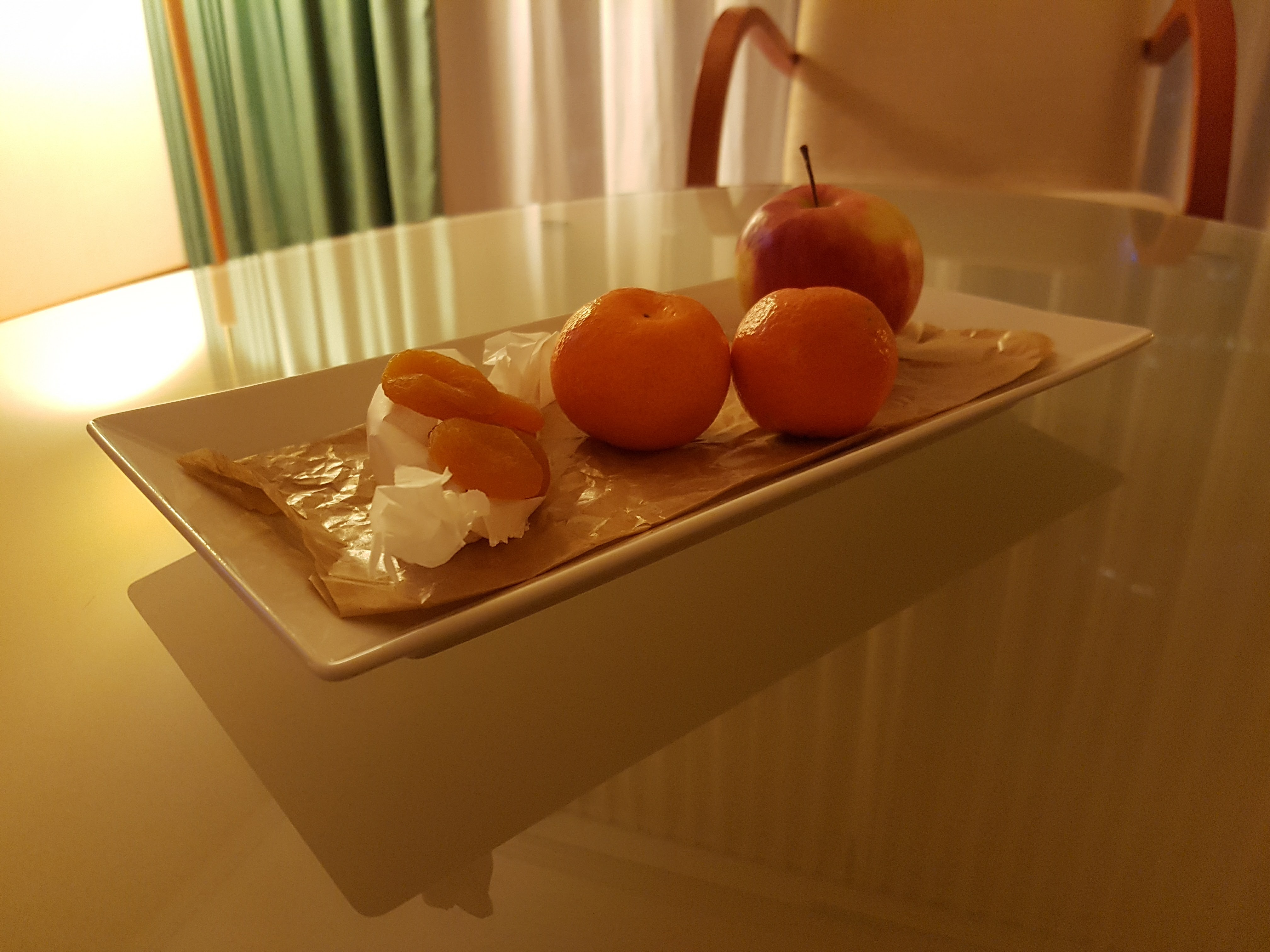 Na stoliku kawowym w pokoju dziennym znajdujmy też prezent powitalny (tak zwaną wstawkę) – świeże i suszone owoce. Na przestrzeni wizyt w Radisson Blu Centrum mieliśmy okazję doświadczyć wielu bardzo różnorodnych wstawek, co należy hotelowi zaliczyć na plus.