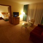 W hotelu są jednak pokoje, z których widok na Pałac jest dobry, więc jeśli komuś zależy na tego typu atrakcjach, warto to zaznaczyć w rezerwacji lub w czasie meldowania się w hotelu. W naszej ocenie najładniejszy widok na centrum, a w szczególności na wieżowiec Cosmopolitan, plac Grzybowski, Pałac Kultury i Nauki ma narożny pokój biznes 1022 na ostatnim pietrze. Ale wróćmy do naszego obecnego pokoju. Apartament 850 jest bardzo przestronny. Wchodzimy do pokoju, który jest rodzajem salonu, z wygodną kanapą, fotelem i stolikiem kawowym, oraz szafką z telewizorem. W drugiej części tego pomieszczenia znajduje się duże biurko do pracy, oraz szafka skrywająca minibar, na której znajduje się ekspres, zestaw do parzenia herbaty i inne podobne utensylia.