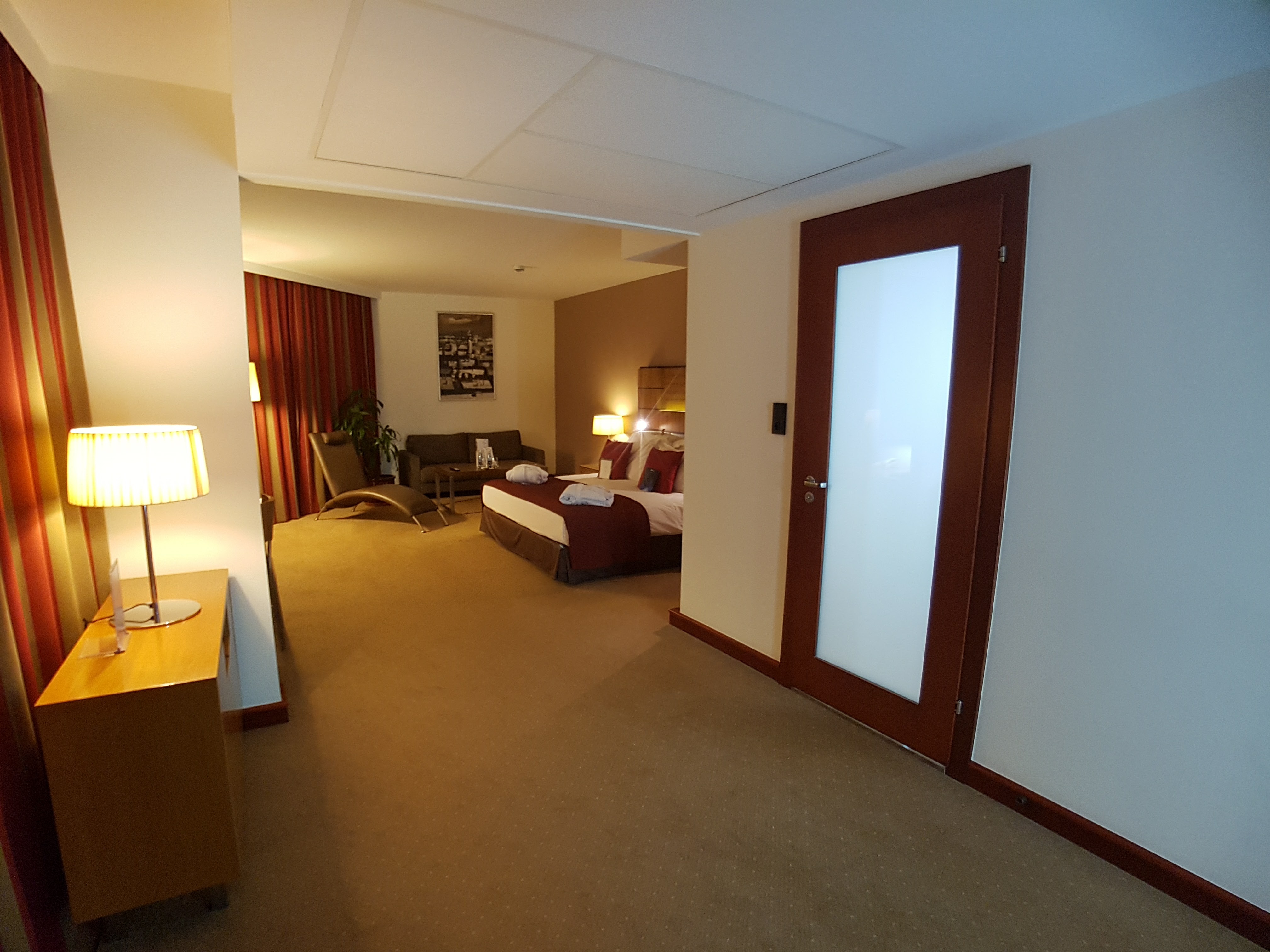Pokój 451, znajduje się na 4 piętrze, po lewej stronie od wind. Jest to pokój typu junior suite. Pokój jest bardzo przestronny, ma nieco nieregularne kształty, wynikające z obrysu budynku. Po wejściu do pokoju znajdujemy się w czymś w rodzaju otwartego przedpokoju, który umożliwia nam widok na część pokoju, którego druga część zasłonięta jest ścianą, za którą znajduje się łazienka. Na pierwszym widoku dostrzegamy dużą szafę ubraniową (w której znajdziemy szlafroki, żelazko, deskę do prasowania, sejf i inne podobne rzeczy, typowe dla hoteli pięciogwiazdkowych). Na ścianie przeciwległej do wejścia znajduje się duże okno z widokiem na budynek po drugiej stronie ulicy. Pod oknem znajduje sie szafka, w której znajdziemy zestaw do parzenia herbaty. Dalej ustawione jest biurko oraz kolejna szafka – mini bar. Obok swoje miejsce znalazła podstawka do bagażu a nad nią wisi telewizor. Po przeciwnej stronie pokoju znajduje się duże, wygodne łóżko typu king, z dwiema półko-szafkami nocnymi po bokach (z gniazdkami do podręcznego ładowania gadgetów podczas snu!). Obok łóżka znajduje się stolik kawowy i kanapa, oraz designerski i wygodny szezlong. W tej części pokoju znajdziemy również duże przeszklone drzwi prowadzące na maluteńki balkon lub rodzaj szklanego wykuszu, z którego rozpościera się podczas pięknej pogody widok w kierunku krakowskiego rynku (w czasie naszego pobytu był smog w Krakowie więc z ładnego widoku nici).