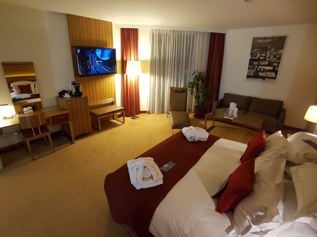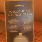 Ponieważ jest już późno, hotelowe lobby w czasie naszego przyjazdu jest w zasadzie puste. Na recepcji wita nas obsługa hotelu, dopełniając formalności meldunkowych. Pod koniec procedury, z ciekawości pytamy o przydzielone pokoje – byliśmy tu już wcześniej, jesteśmy ciekawi, czy będzie to ten sam pokój. I pierwszy zgrzyt – jeden z pokoi został upgrade’owany do junior suite (narożny, w którym byliśmy już wcześniej, z małym balkonem), ale drugi to pokój standard. Konsternacja. Powołujemy się na wcześniejsze ustalenia mailowe, ale pracownice recepcji nie dają nam wiary, oczekują okazania potwierdzenia uzgodnień. Tworzy to pewien dysonans odnośnie hasła przewodniego obsługi w sieci Radisson Blu – #YesICan, niemniej po chwili odnajdujemy właściwego maila i pokazujemy go paniom. Tu następuje druga fala konsternacji – panie recepcjonistki są, z niewiadomych przyczyn, wyraźnie niezadowolone, głośno komentując w niepochlebny sposób profesjonalizm i sposób działania swojej koleżanki – autorki maili. Po kolejnej dłuższej chwili otrzymujemy klucze do obu pokoi, a na odchodne informację, że śniadanie w hotelowej restauracji przysługuje tylko jednej osobie. Nie dostajemy informacji, o której śniadanie się odbywa, ile ewentualnie kosztuje, ani żadnych dodatkowych danych. Taki sposób komunikacji jest dość szokujący i jest to drugi hotel w sieci Club Carlson, w którym jesteśmy w ten sposób traktowani, choć odwiedziliśmy ich wiele na całym świecie. O dziwo, ten drugi ma swoją siedzibę w tym samym mieście.