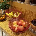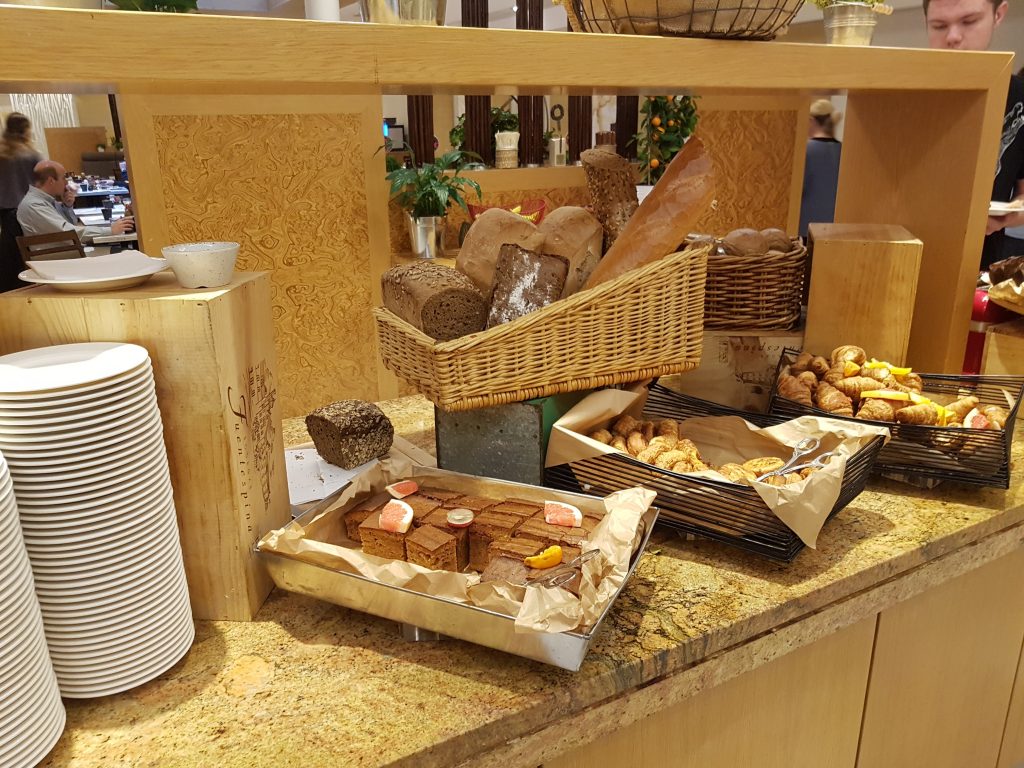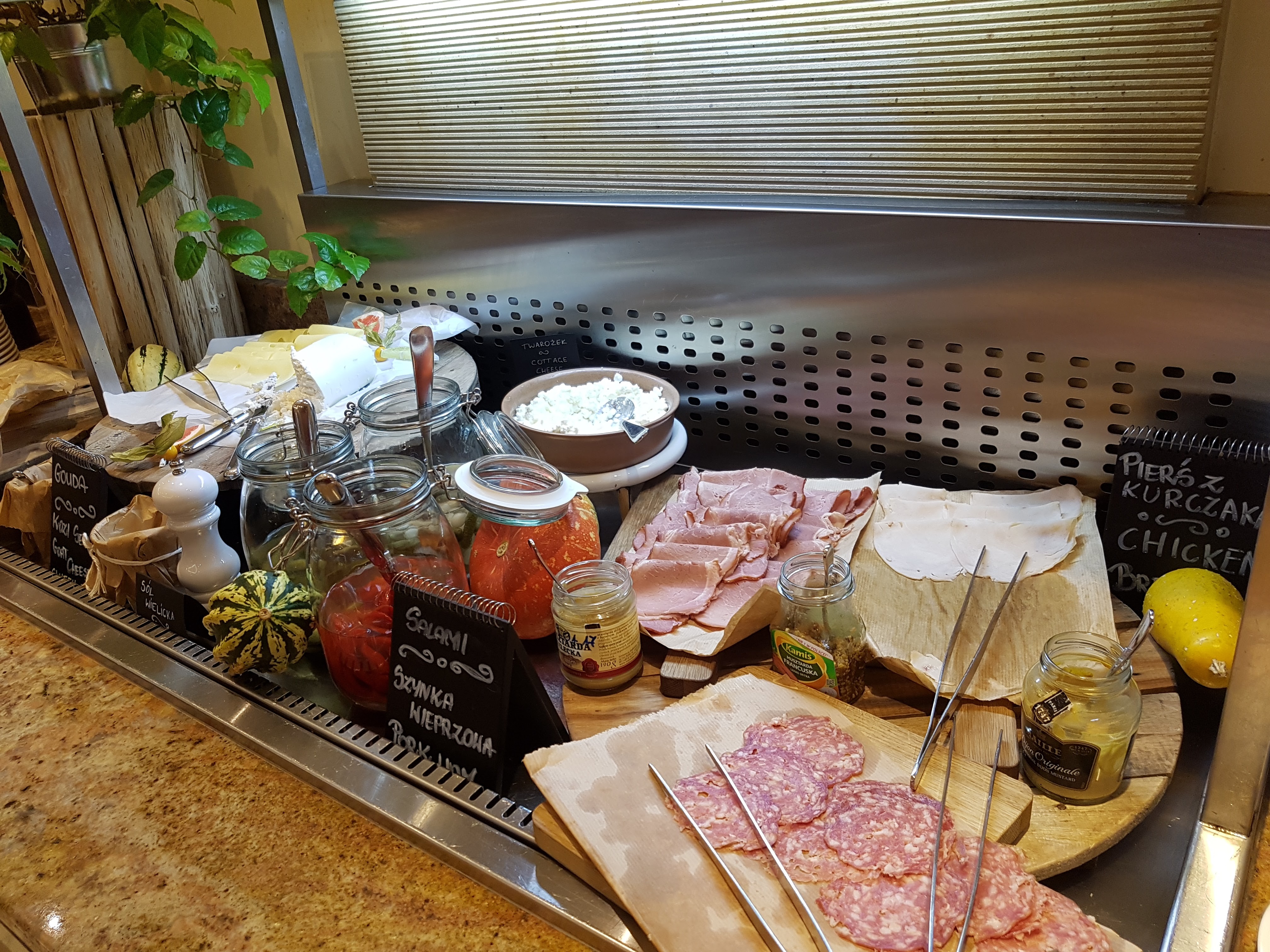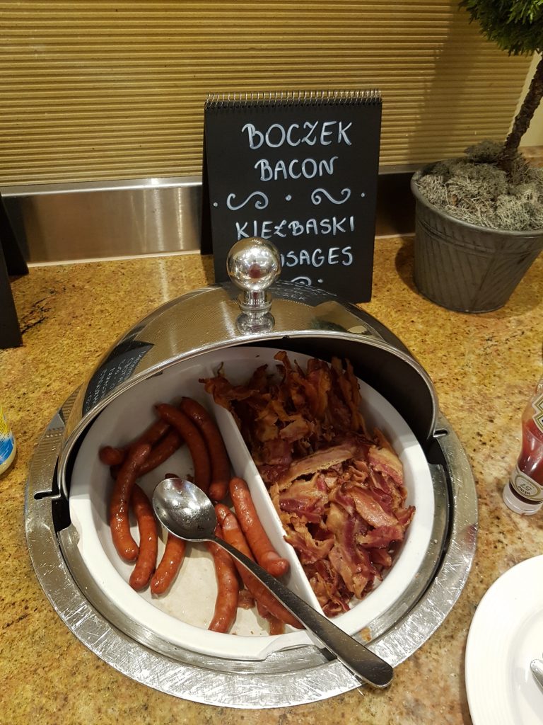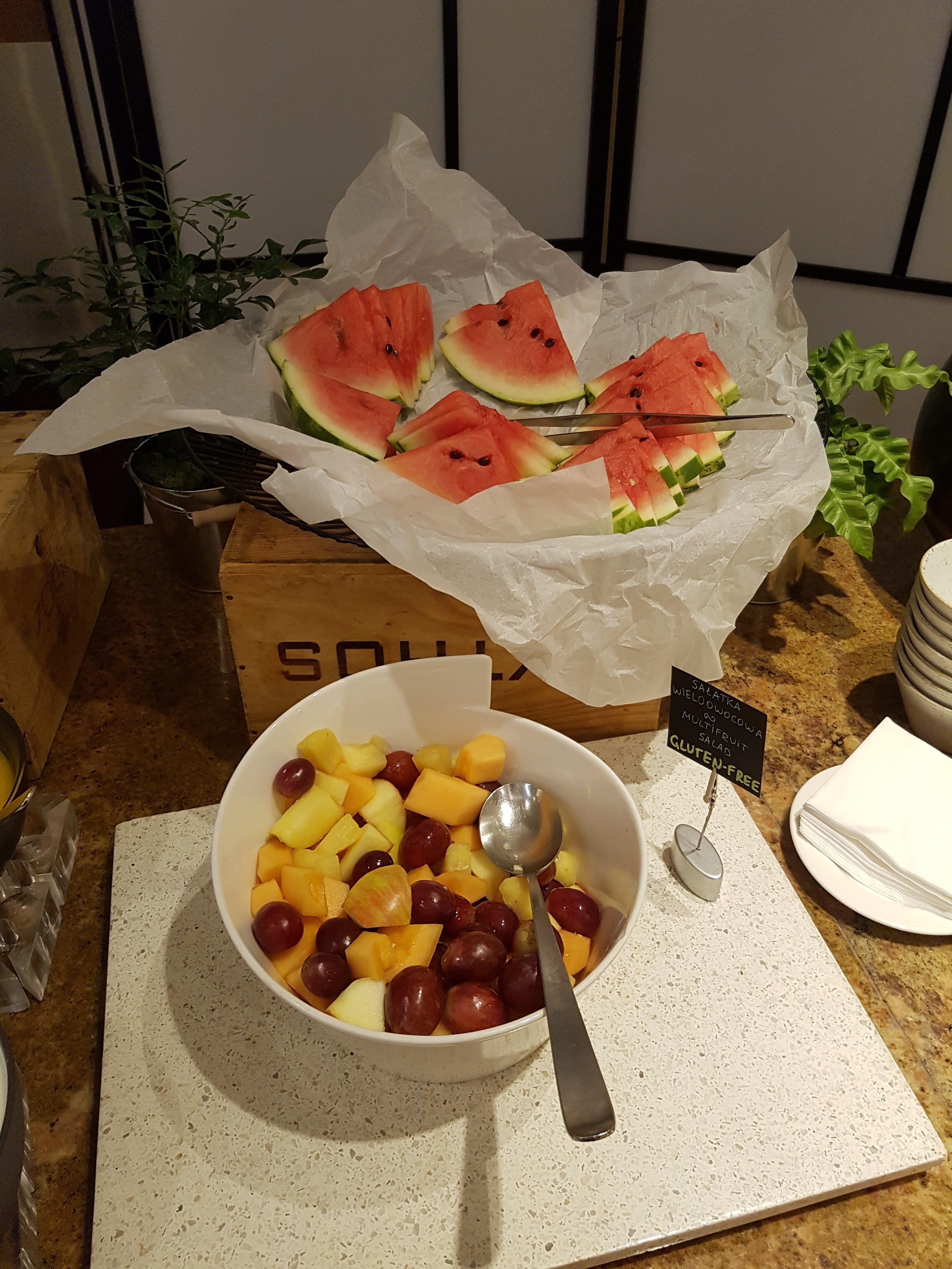 W skład menu wchodzą wszystkie te rzeczy, których po Radissonowskim SuperBreakfast możemy się spodziewać – są soki owocowe, w tym miejsce przygotowane specjalnie do samodzielnego wyciskania świeżego soku pomarańczowego, jest sok pomidorowy z dodatkami i przepisem na Morning Mary (oraz inne soki owocowe, w tym sok porzeczkowy), jest wędzony łosoś, są gotowe kanapki, jest wybór serów, są wędliny, świeże warzywa i owoce, płatki do mleka, słodkie wypieki, pieczywo w wielu rodzajach. Są też dania na ciepło – kiełbaski, smażone plasterki ziemniaków w stylu frytek, pieczarki na ciepło, bekon, jajka na miękko i twardo, jajka w kokilkach, amerykańskie pancakes (pankejki). Wybór jest spory, ale zabrakło tego, co wyróżniało śniadanie w Radisson Blu Kraków spośród innych ofert podczas naszych poprzednich wizyt – oferta regionalnych wyrobów wędliniarskich i serowych, oraz lekkie wino musujące. Szkoda.