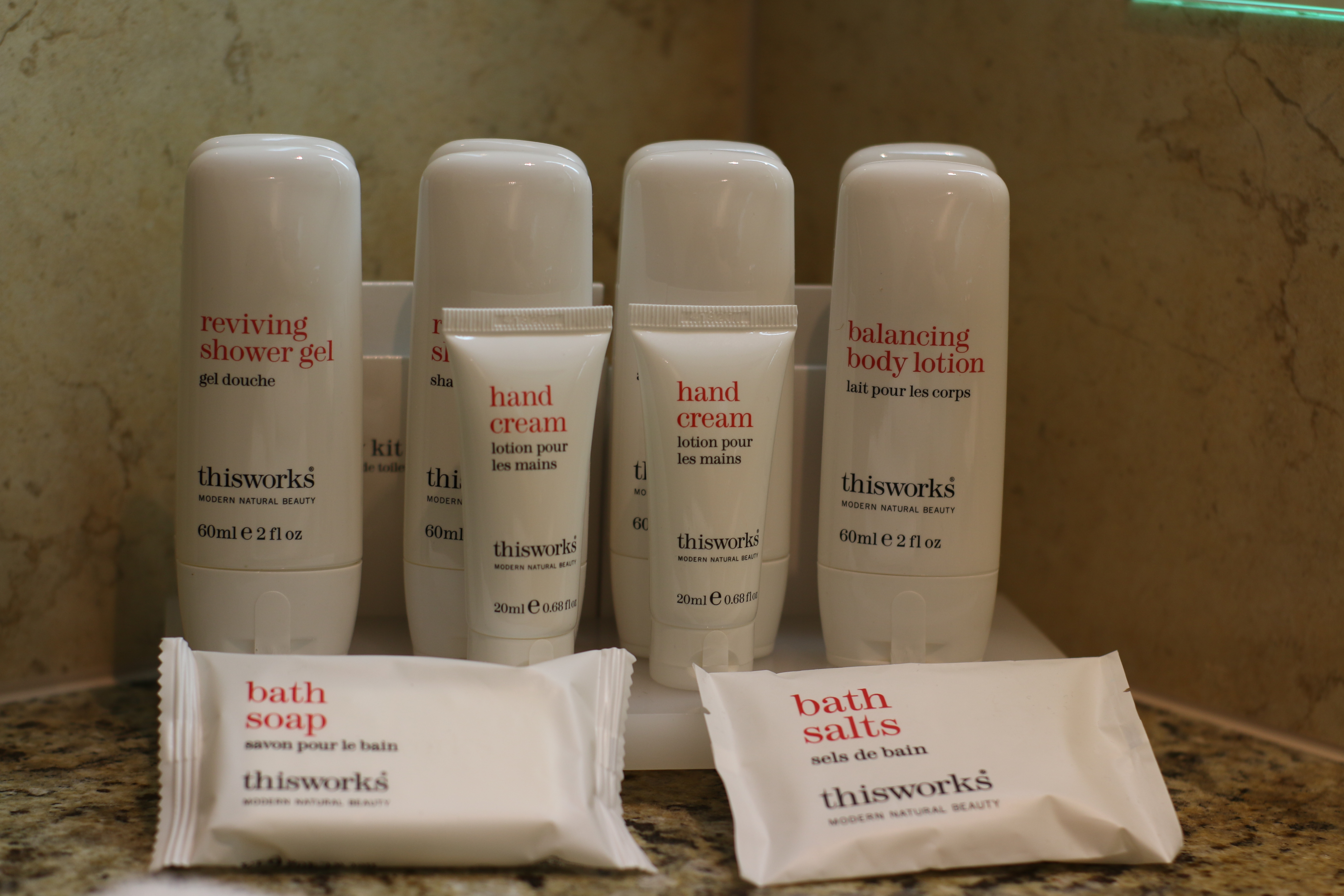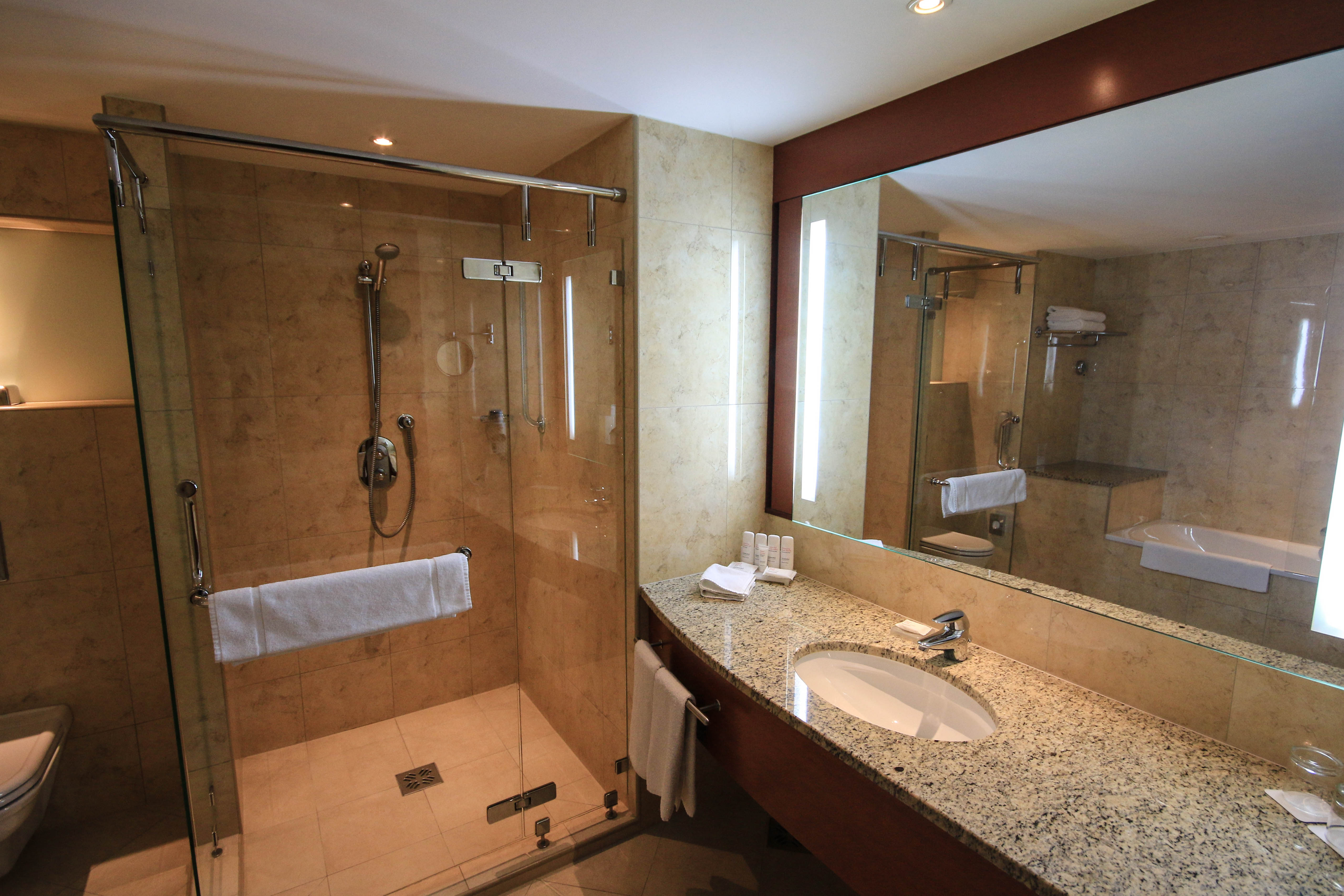 Łazienka wyposażona jest w wannę z prysznicem, umywalkę z dużym blatem i wielkim lustrem, dodatkowym małym lusterkiem kosmetycznym, oraz toaletę. Jest też podwójny komplet kosmetyków ‘this works’, standardowych w hotelach marki Radisson Blu. Dzięki dość zachowawczemu i klasycznemu designowi pokój nie robi wrażeni przestarzałego. Mimo swojego wieku całość infrastruktury utrzymana jest w dobrym stanie, choć prosi się o przynajmniej częściowe odświeżenie – bardziej w celu wprowadzenia odrobiny światła i jasności w hotelowe wnętrze, niż z powodu zużycia.