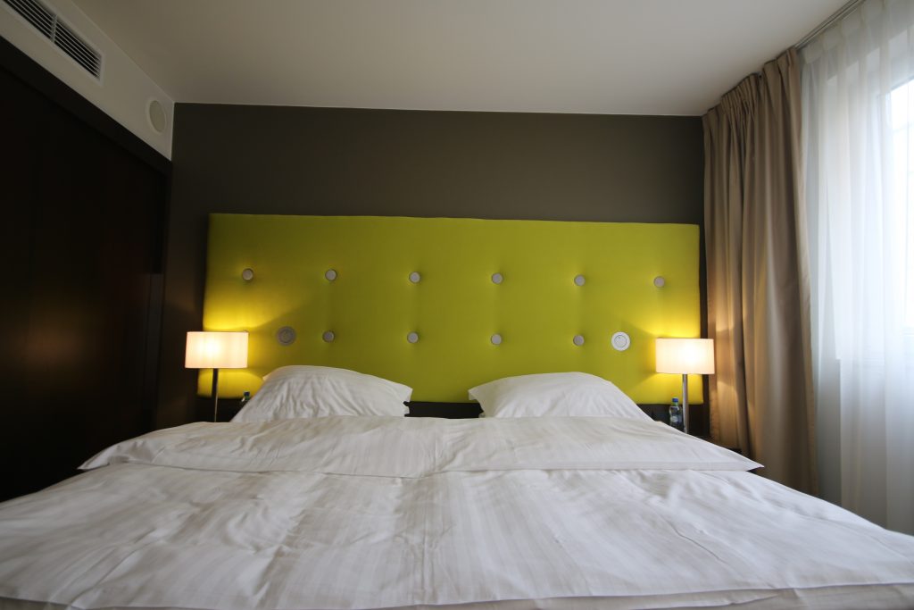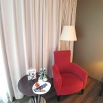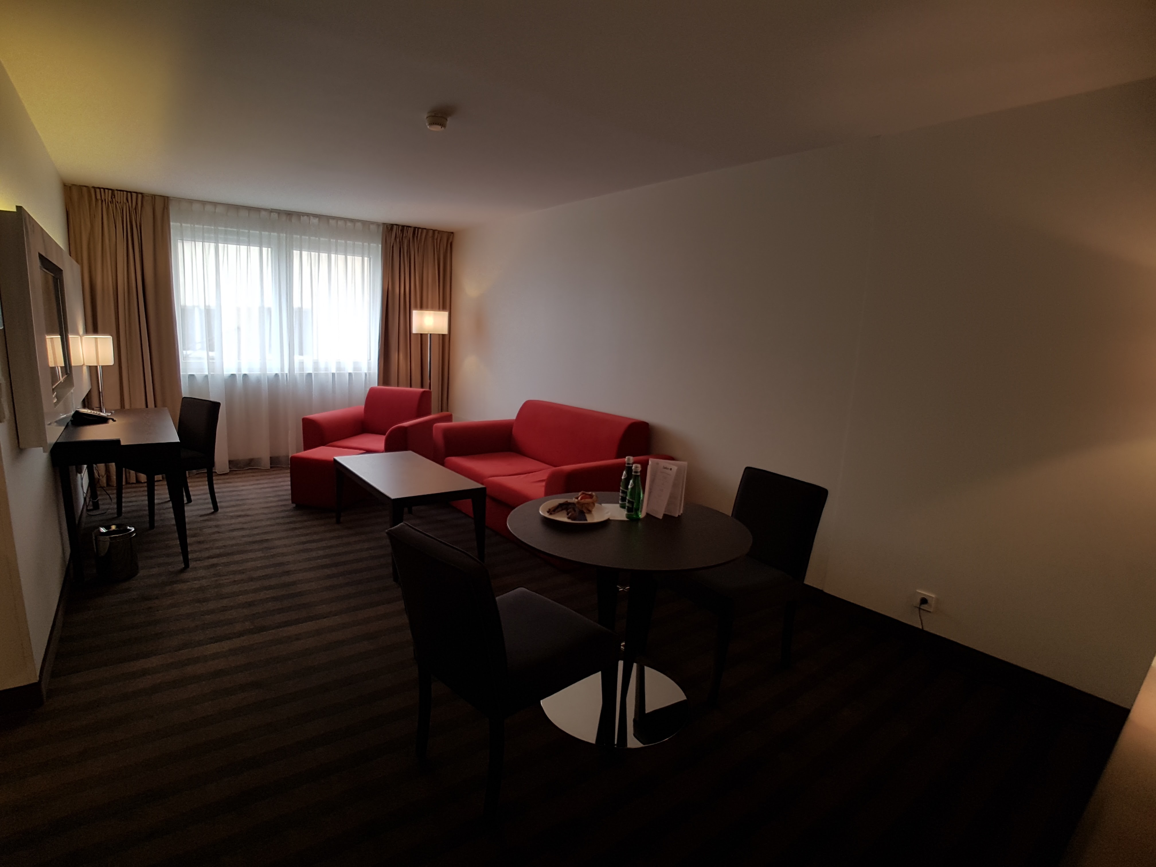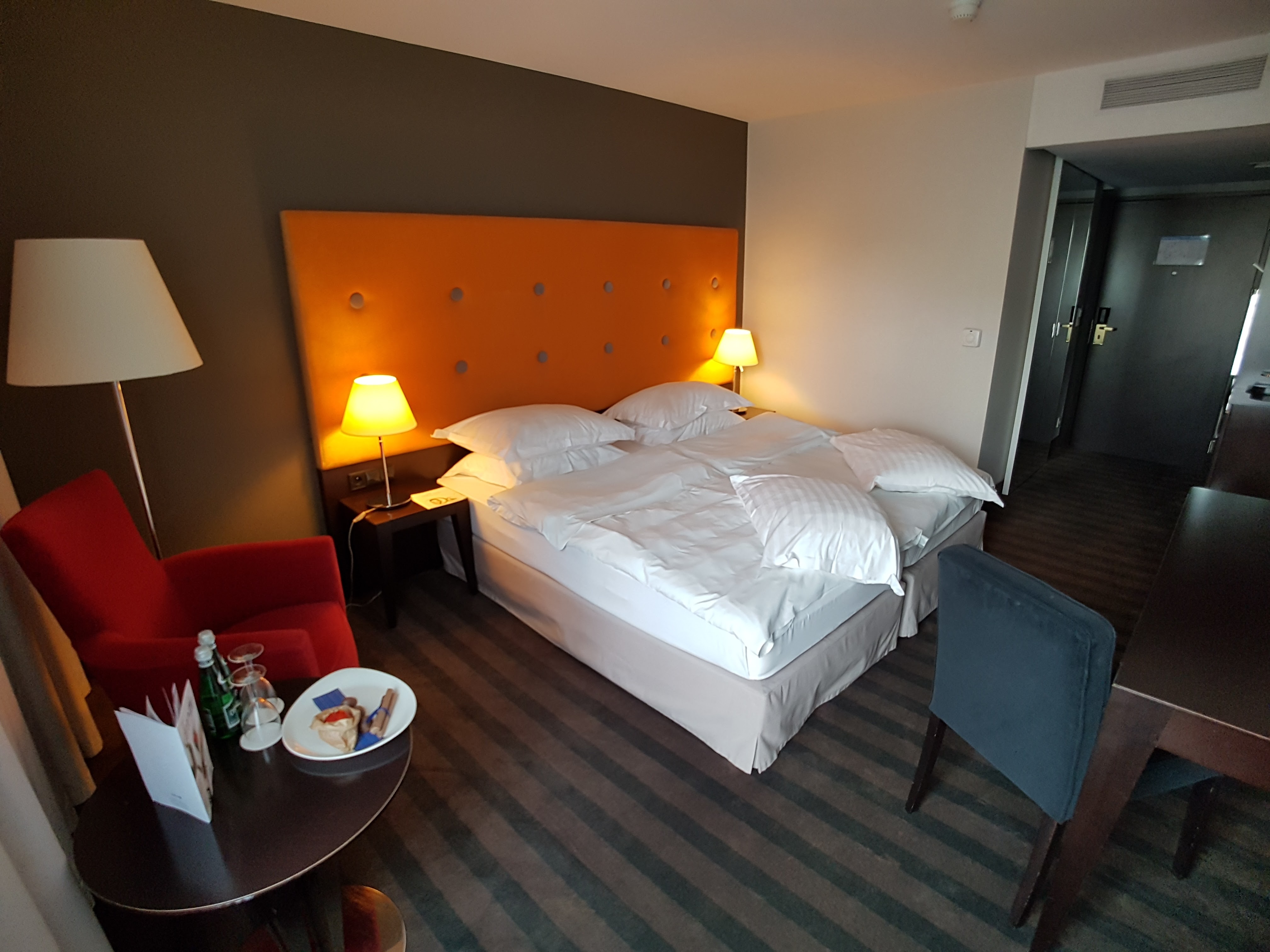 Na szóstym piętrze, z dala od wind, w tylnej części korytarza znajdujemy swój pokój. Jest stosunkowo niewielki, choć zawiera na swojej małej przestrzeni wszystkie niezbędne elementy pokoju, w którym można odpocząć i popracować. Mamy więc łóżko, biurko, oraz fotel ze stolikiem kawowym. Jest też okno przypominające balkonowe, choć zdecydowanie węższe, wychodzące na hotelowe patio. Widok z okna jest ciekawy. Zostajemy też ugoszczeni liścikiem od Operation Managera, w którym życzy nam udanego pobytu, oraz prezentem powitalnym w postaci słodyczy, owocu i wody. Bardzo miły gest, dziękujemy.