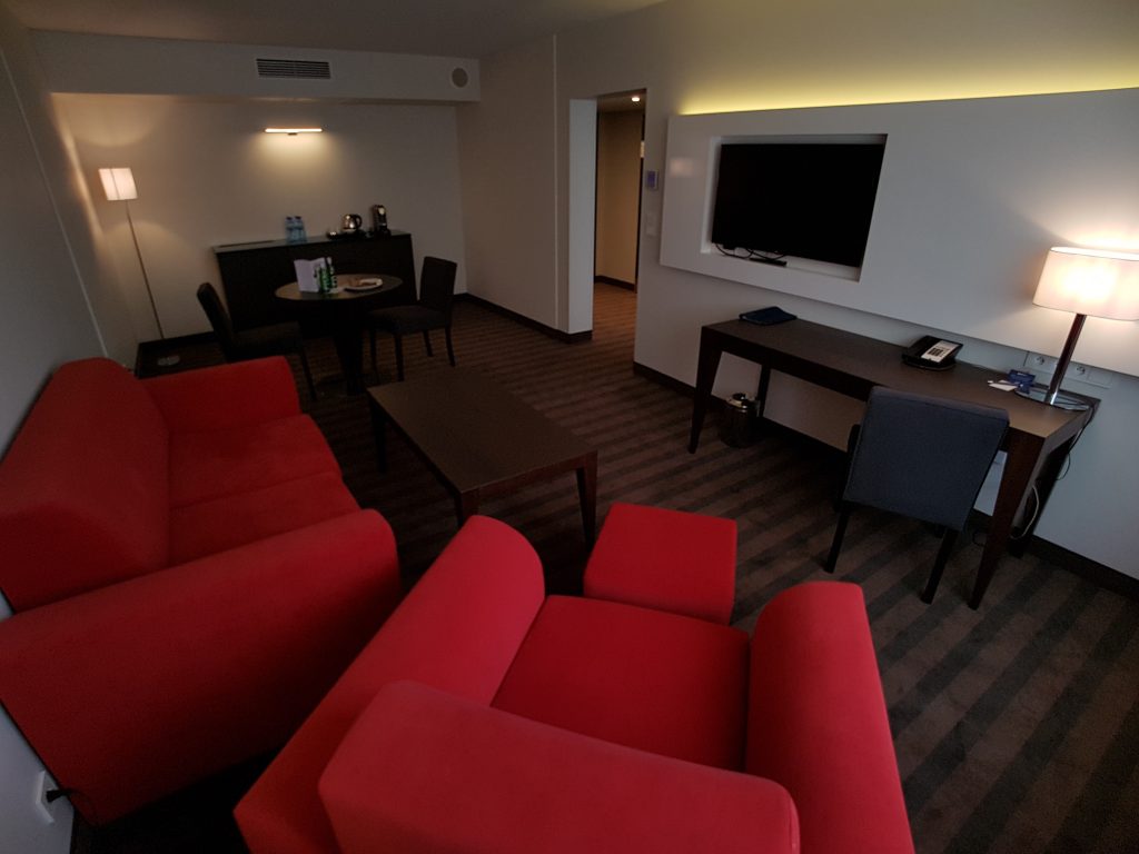 Kolejne pomieszczenie to sporych rozmiarów pokój dzienny. Tu znajdziemy wszystko, czego można by po takim pokoju oczekiwać – jest wygodne biurko do pracy, jest szafka z minibarem, ekspresem do kawy i zestawem do parzenia herbaty, jest okrągły stolik z dwoma krzesłami, jest też wygodna, rozkładana kanapa z niskimi stolikiem kawowym, oraz fotel z podnóżkiem.