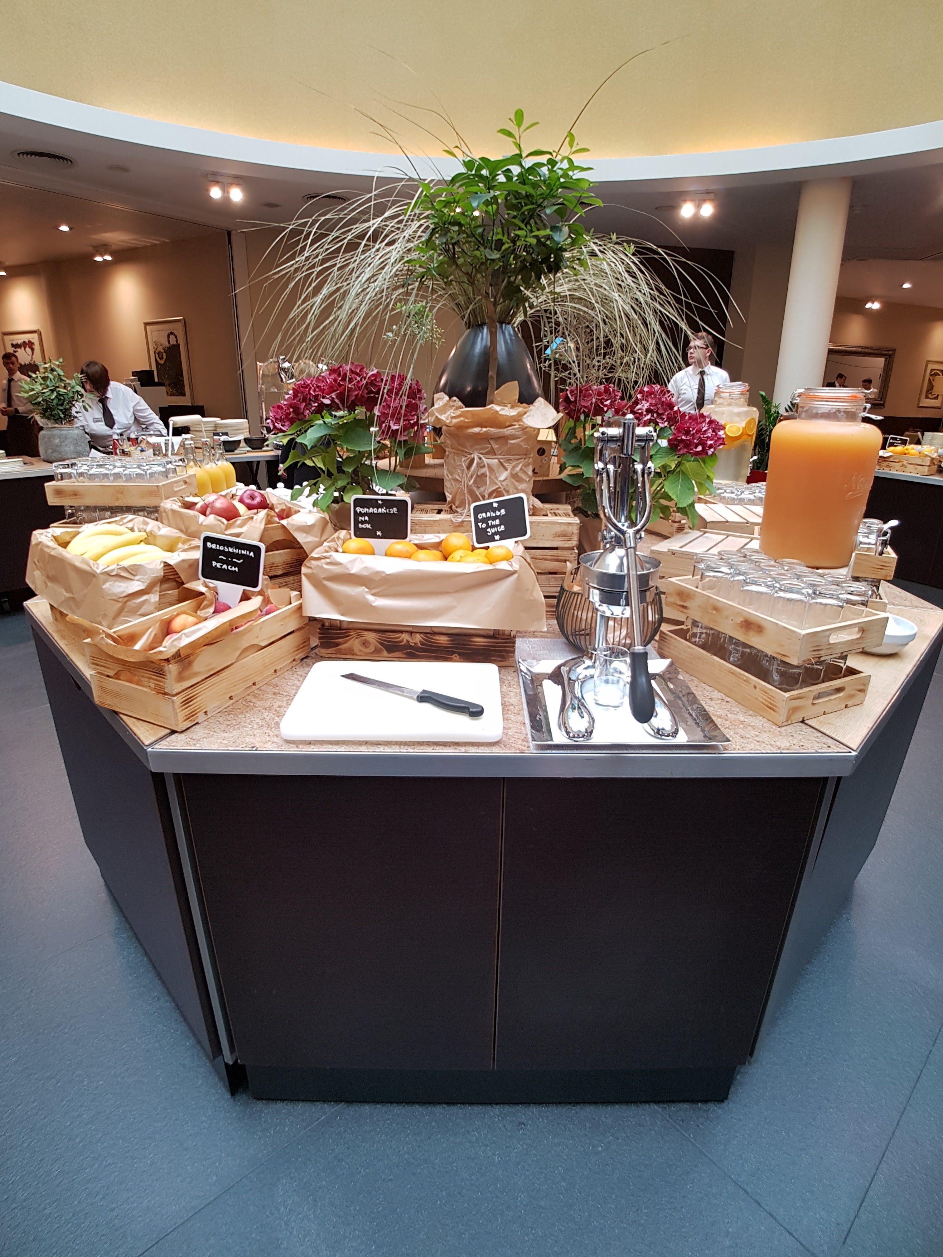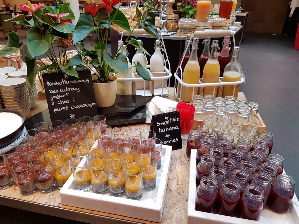 A ekspozycja jest na prawdę świetna – wszystkie potrawy wyglądają bardzo zachęcająco i pachną apetycznie. Był zatem osobny bufet z daniami ciepłymi – fasolka, kiełbaski, jajka na kilka sposobów, bekon, pankejki i temu podobne rzeczy. Drugi bufet to wędliny, sery, ryby, świeże warzywa, świeże owoce – długo by wymieniać. Kolejny to pieczywo, bułki, croissanty, kajzerki, słodkie wypieki, ciasta, muffinki, muesli i płatki wraz z dodatkami, desery z dodatkiem świeżych owoców i chia oraz koktajle. Centralny bufet to królestwo napojów – herbaty, wody gazowane bądź nie, soki owocowe i warzywne, a także wyciskarka do świeżego soku pomarańczowego. W połączeniu ze schłodzonymi pomarańczami to idealna kombinacja. I odrobina ruchu z samego rana! Dodatkowo, w restauracji porozstawianych jest kilka dużych ekspresów do kawy, w których każdy kawosz znajdzie dla siebie coś co lubi.