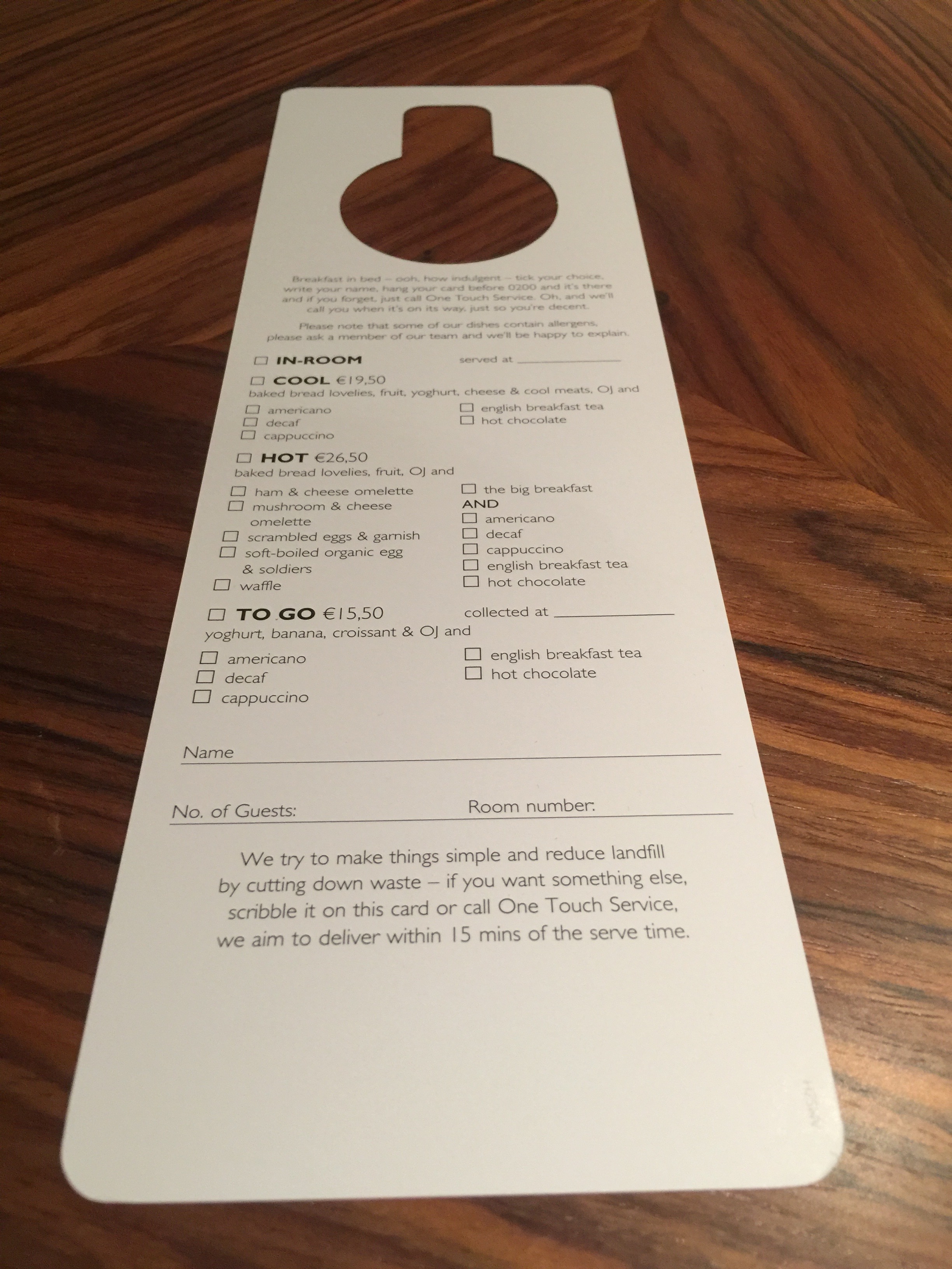 Radisson Blu Hotel, Amsterdam – menu „śniadanie do łóżka”