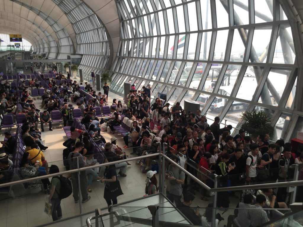 Nasz powrotny lot z Bangkoku na pokładzie Airbusa 380 odlatuje przed godziną 14.00, więc na lotnisku pojawiamy się około południa. Do Bangkoku podróżowaliśmy w klasie pierwszej Emirates a teraz lecimy w klasie biznes. Stanowiska check-in dla naszej linii mieszczą się w strefie T.