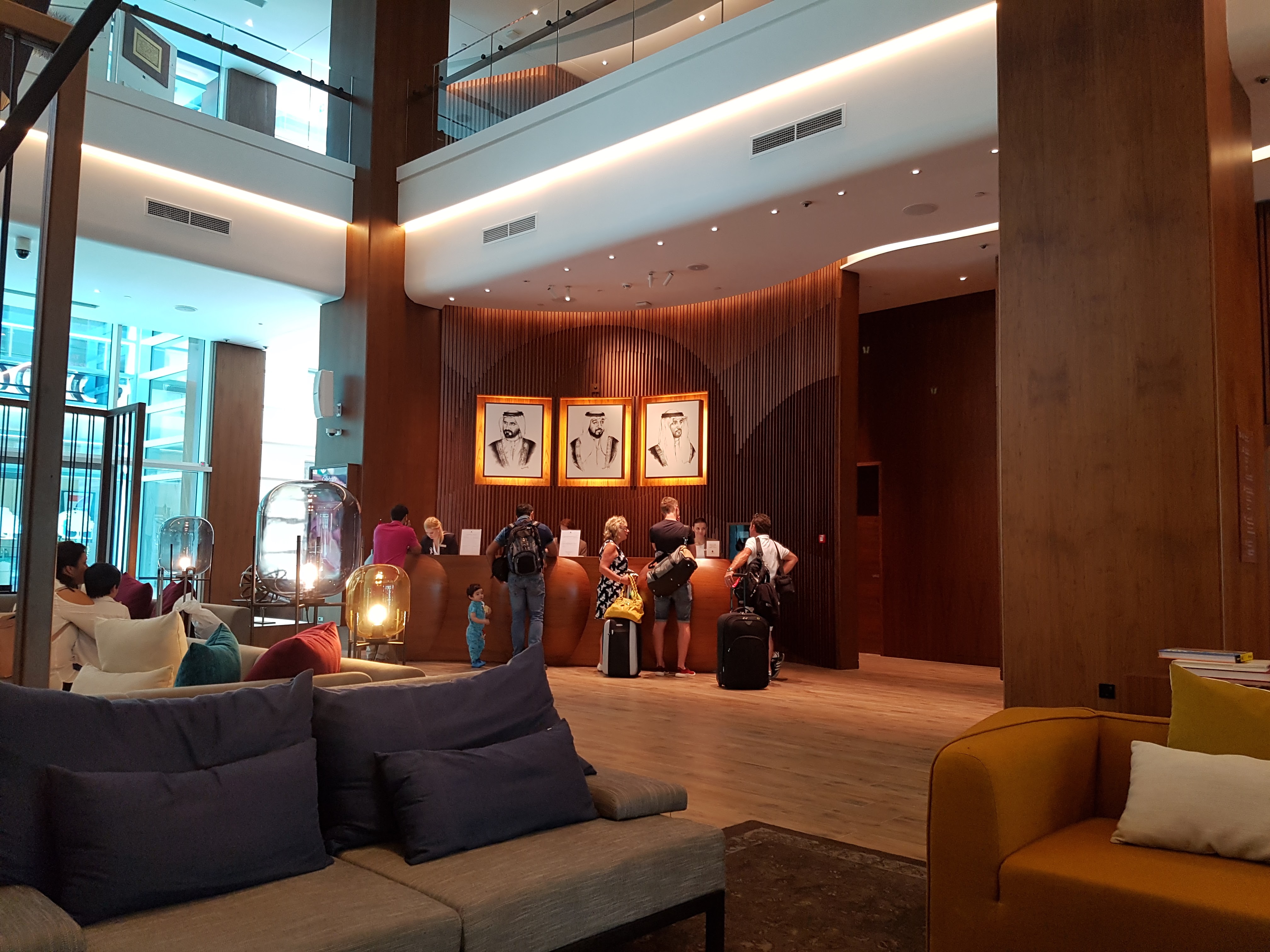 Po locie Ukraine Airlines docieramy do hotelu taksówką (około 60AED z lotniska DXB) w zasadzie nad ranem – jest godzina około 4 rano czasu miejscowego. Na recepcji wita nas kilkuosobowa obsługa, która w obszerny sposób wyjaśnia usługi oferowane przez hotel, w tym czas i miejsce serwowania śniadania, lokalizację basenu, siłowni, restauracji i punktów gastronomicznych na terenie hotelu, a także informuje o darmowym transporcie do nieodległego Burj Khalifa, Dubai Mall, Dubai International Financial Center czy Dubai World Trade Center. Dodatkowo, zostajemy poinformowani o przysługujących nam przywilejach jako członkowie programu Hilton Honors, wraz z informacją, że otrzymujemy bezpłatny upgrd do apartamentu. Jesteśmy zmęczeni podróżą i późną porą, więc dziękujemy za upgrade i informacje i czym prędzej ruszamy do windy.