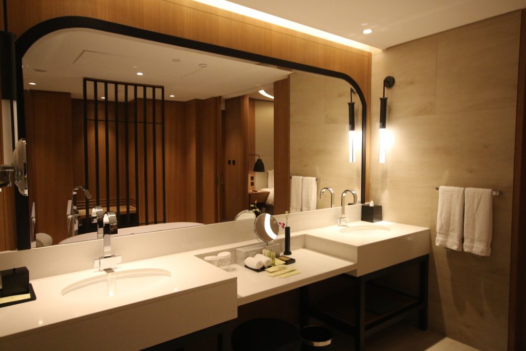 Dalszą część apartamentu stanowi łazienka. Nie jest łatwo ją opisać. Nie dlatego, żeby czegoś w niej brakowało – wręcz przeciwnie. Żeby uzmysłowić sobie jej ogrom, trzeba ją po prostu zobaczyć. Całość łazienki ze wszystkimi jej częściami jest nie mniejsza niż pokój wypoczynkowy czy sypialnia, a może nawet większy? W każdym razie – jest ogromna! Główną część stanowi wolnostojąca wanna, z której przy otwartych drzwiach rozpościera się piękny widok na sypialnię. Do naszej dyspozycji są też dwie umywalki i wielkie lustro, wraz ze wszystkimi udogodnieniami, o których w przypadku takiego hotelu nie wypada nawet wspominać – kosmetyki, świetna suszarka, podświetlane lustro powiększające do makijażu i temu podobne pozycje obowiązkowe w miejscu takim jak to. Ale to nie wszystko. dla wygody gości pomiędzy umywalkami stworzono specjalne miejsce do makijażu i pielęgnacji, z wygodnym siedziskiem i kolejnymi udogodnieniami jak dodatkowe lusterka, różnego rodzaju akcesoria kosmetyczne i higieniczne. Jednym słowem czego dusza zapragnie. W łazience również znalazło się miejsce na garderobę w postaci kilku szaf, oraz dedykowanego miejsca do rozłożenia walizki.