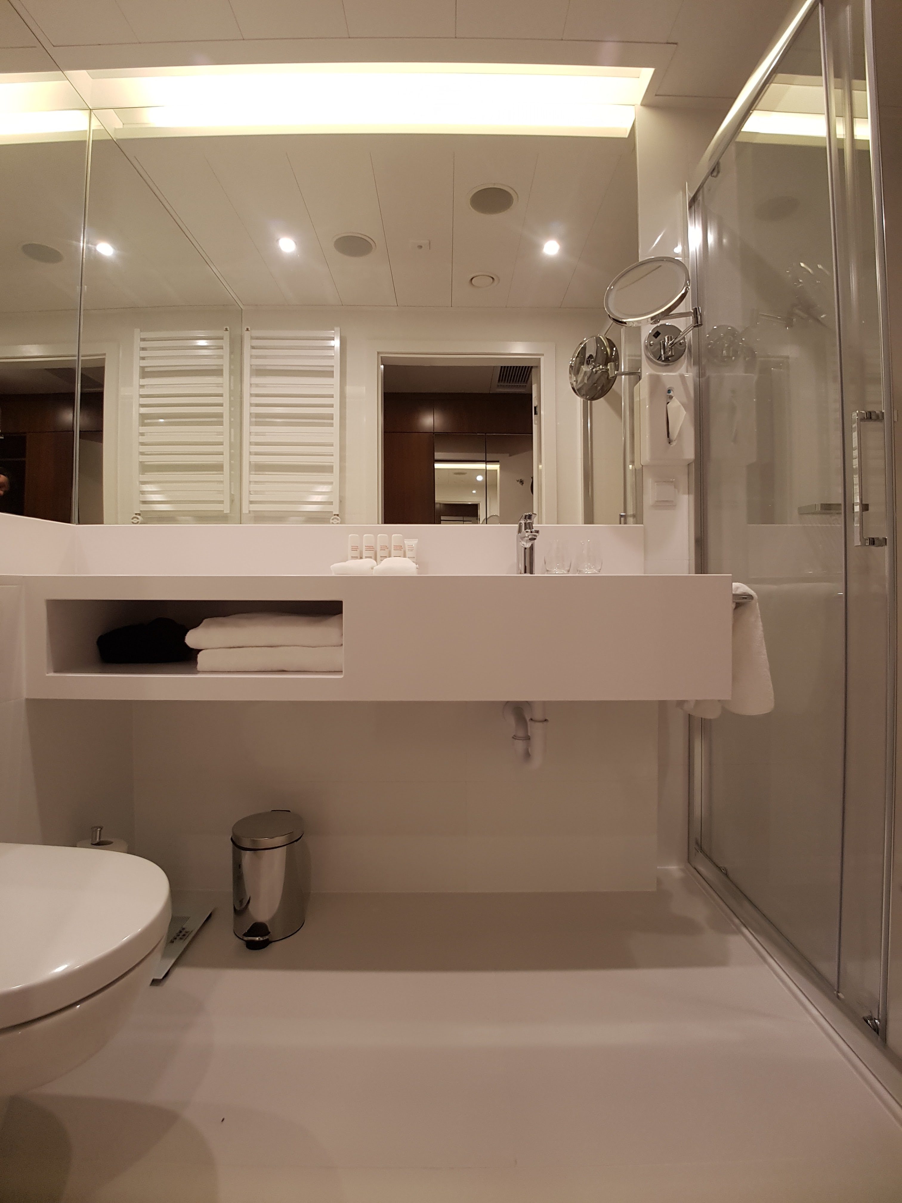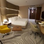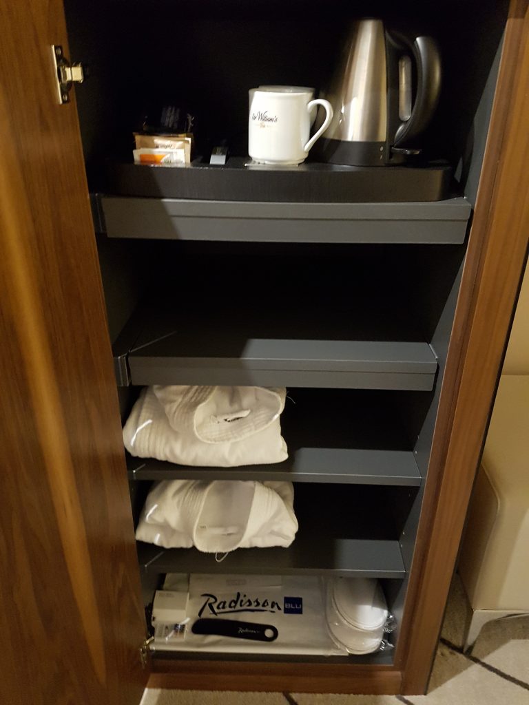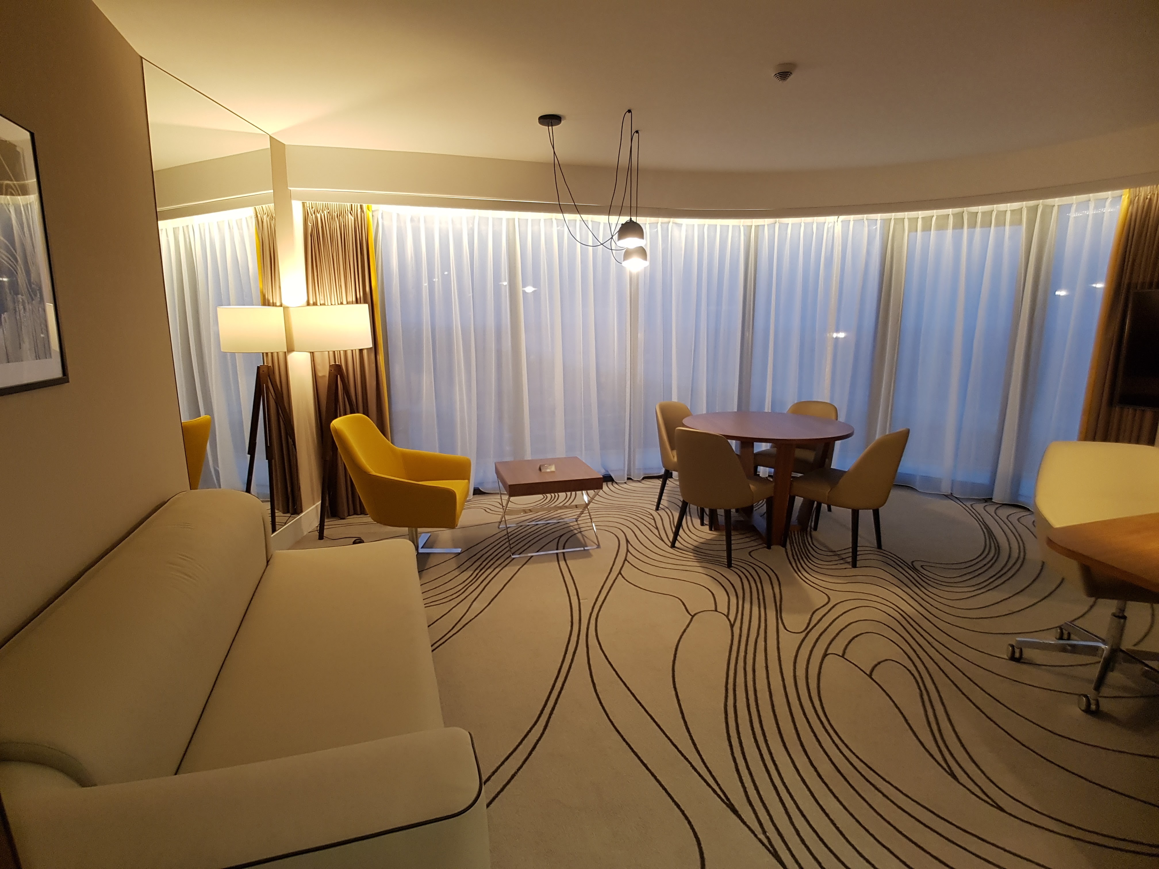 Jest też kilka mankamentów – jak na pokój klasy business przestrzeni do pracy jest niewiele. Kolejnym jest łóżko, składające się z dwóch połączonych ze sobą części przykrytych wspólną nakładką i prześcieradłem. Takie rozwiązanie pozwala hotelowi na pewno bardziej elastycznie zarządzać typami oferowanych pokoi w danej kategorii, niemniej twierdzenie, że jest to łóżko typu king jest nieco na wyrost. Inny problem objawia się nam, kiedy próbujemy przygotować herbatę – specjalnie przeznaczona do zestawu kawowego i czajnika półka w szafce jest zainstalowana o kilka centymetrów za wysoko, co powoduje problemy przy jego wyciąganiu i chowaniu. Drobna rzecz, ale takich znaleźć można więcej. Mimo bardzo młodego wieku hotelu widać już ślady zużycia mebli, a wykładzina, która prezentuje się świetnie na zdjęciach ma trwałe zabrudzenia, szczególnie w części blisko drzwi. W minibarze znajdziemy piwo w butelce z kapslem, ale nie znajdziemy już do niej otwieracza. Takich małych uchybień można by wymieniać wiele, a jeśli ktoś byłby zdeterminowany, aby ich szukać, pewnie znalazłby ich dużo więcej. Poniekąd można to tłumaczyć młodym wiekiem hotelu i okresem docierania się, niemniej w niedawno odwiedzonym nowiutkim Park Inn by Radisson Brussels Airport takich problemów nie odnotowaliśmy.
