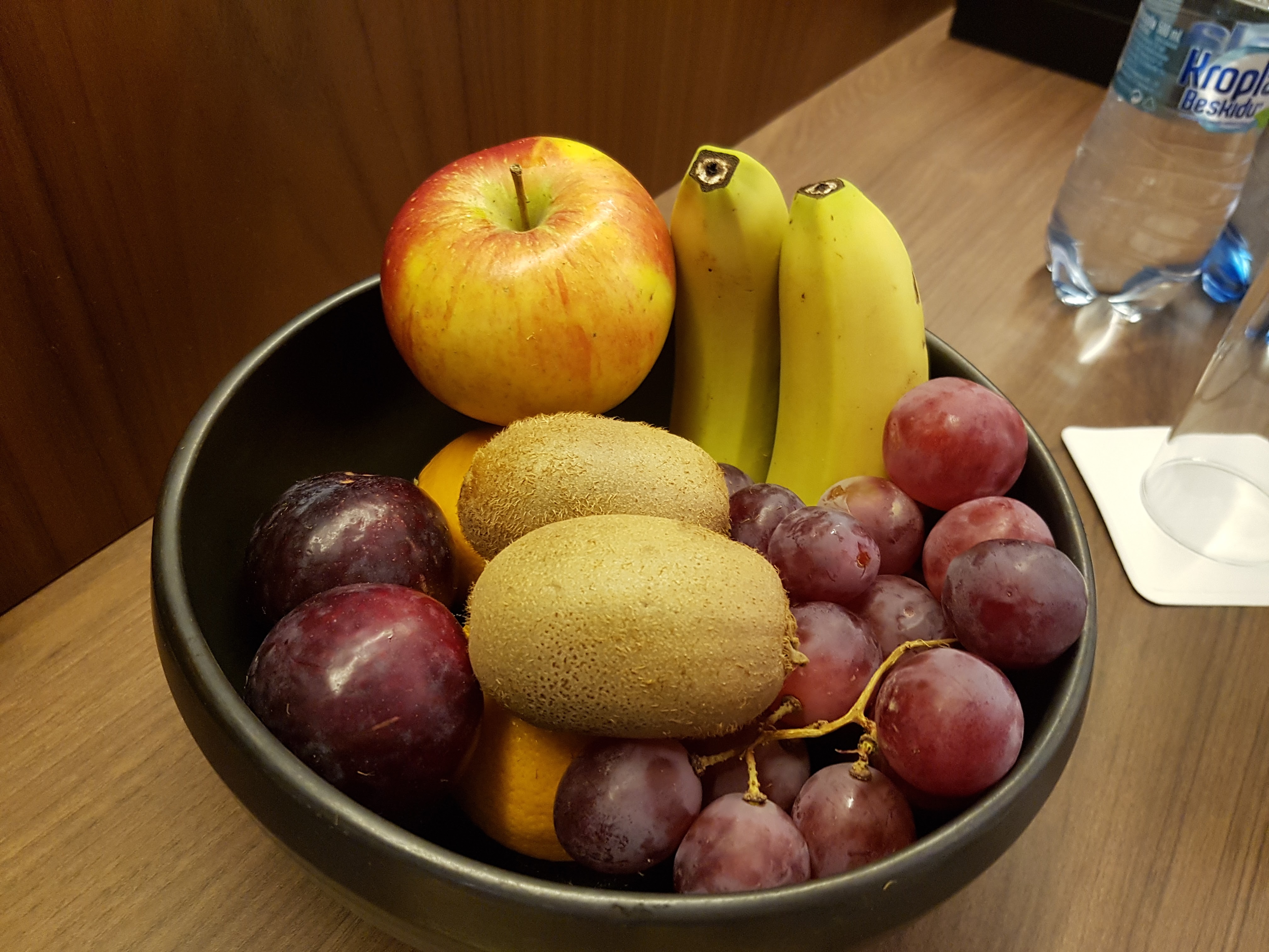Nasz pokój 1105, zlokalizowany na 11 piętrze nie jest duży, ale wyposażono go we wszystkie udogodnienia, których można by się spodziewać po tej klasy hotelu. Mały przedpokój z szafkami skrywającymi między innymi sejf, deskę do prasowania, zastaw kawowy czy minibar. Szafka, w której go znajdziemy dodatkowo wykończona jest imitacją bulaja – małego okrągłego okna spotykanego na okrętach, co jest ciekawym nawiązaniem do nadmorskiej lokalizacji hotelu. Dalej mała, ale bardzo jasna łazienka w kolorze białym. Umywalka, prysznic, toaleta – proste, ale dobre gatunkowo wyposażenie uzupełniają wielkie tafle luster, które mają na celu optyczne powiększenie pomieszczenia. Podobny efekt zastosowano w głównej części pokoju, w której znajdziemy duże łóżko z szafkami nocnymi i ciekawym wykończeniem wezgłowia, kształtem przypominającym fale – wszak jesteśmy nad morzem. Naprzeciwko łóżka duży telewizor oraz blat ciągnący się wzdłuż ściany na której wisi. Blat rozszerza się, przeistaczając się w formę biurka. Na blacie kapsułkowy ekspres do kawy wraz z zapasem kapsułek i filiżankami, oraz jeden z lepszych zestawów powitalnych, na który składają się – spora miska owoców, umieszczone w koszyczku do gotowania na parze słodycze i bakalie, oraz butelka wyśmienitego, a mało znanego w Polsce mołdawskiego wina musującego Cricova. Duży plus! Dalej ustawiono fotel do pracy przy biurku, drugi fotel z małym stolikiem kawowym.