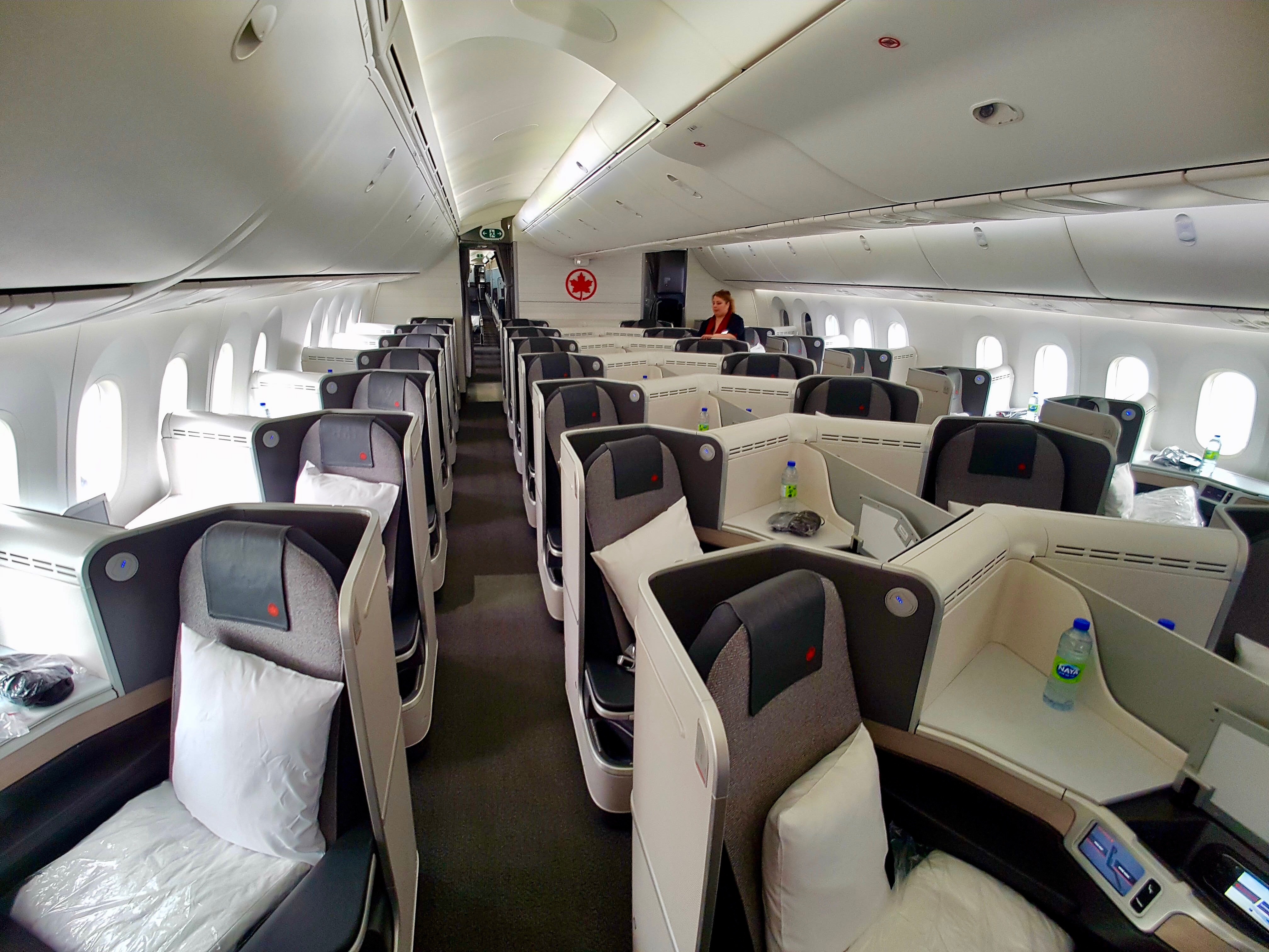 Kabina klasy biznes Dreamliner’a Air Canada składa się z 32 foteli, w układzie 1-2-1, w 'jodełkę’. Układ kabiny jak i same fotele bardzo przypominają te z Dreamliner’a Qatar Airways. Zajmujemy swoje miejsca po prawej stronie kabiny pod oknem (1K, 2K).