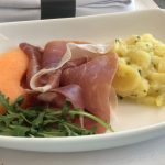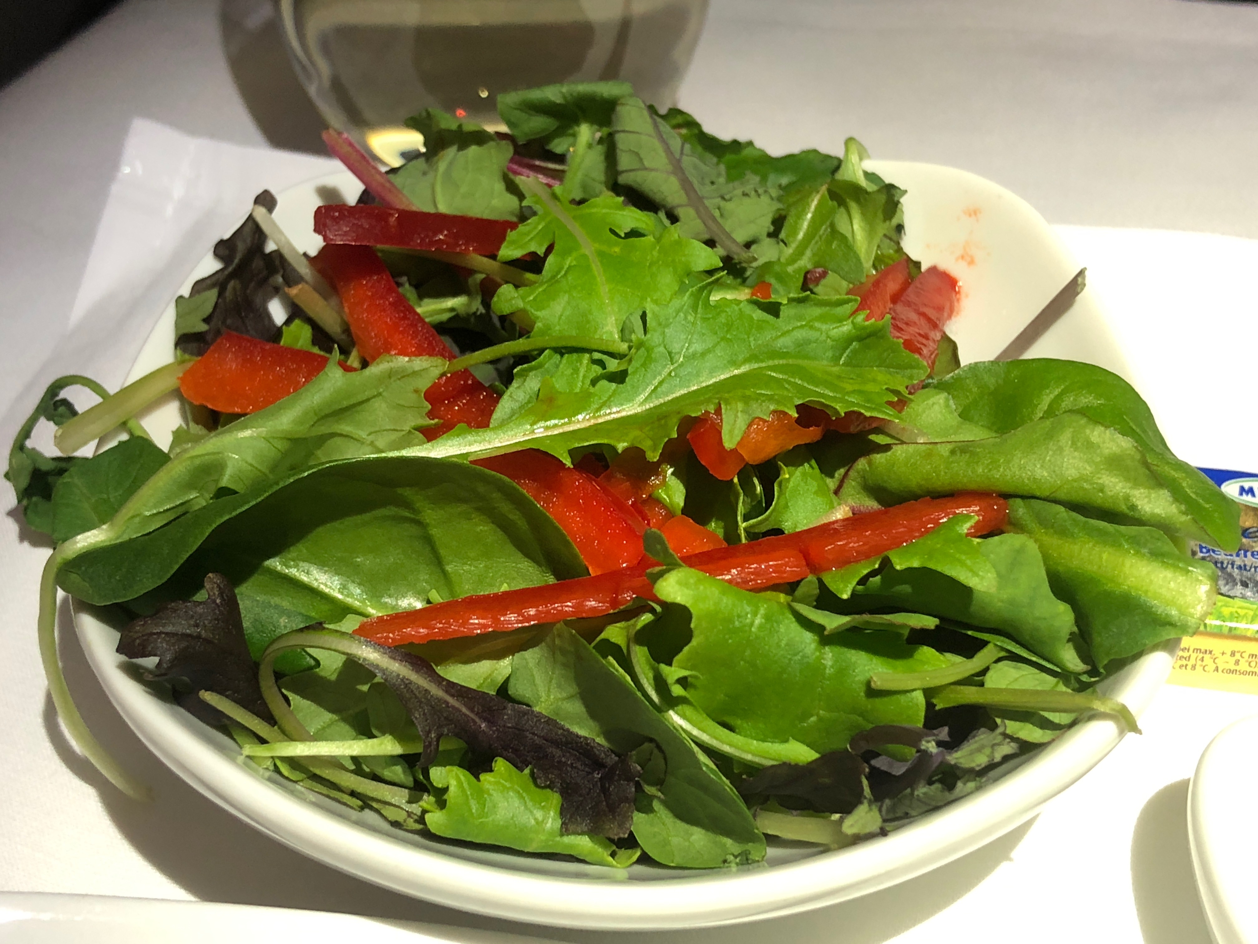 Po serwisie napojów, niemal godzinę po starcie samolotu rozpoczął się serwis obiadowy. Jako przystawkę zaserwowano wędzonego halibuta z rukolą i prażonymi orzeszkami piniowymi. Rybę podano w formie carpaccio. Smak ryby był słabo wyczuwalny i jako taka przystawka nas nie zachwyciła. Na dania główne wybraliśmy odpowiednio stek wołowy oraz kurczaka ze szpinakiem. Stek był nieco przesmażony, ale cały czas miękki, kruchy i soczysty – to i tak niezły wynik jak na jedzenie w samolocie. Dodatki stanowiły ziemniaczki oraz grillowane warzywa. Cała kompozycja dania, wraz z miksem sałat i warzyw z sosem vinaigrette była dobra, a wykonanie i sposób podania jak najbardziej odpowiednie dla tej klasy i długości lotu. Kurczak ze szpinakiem, puree ziemniaczanym i warzywami z grilla również spisał się bez zarzutu – mięso było kruche i soczyste, nie przesuszone, warzywa jędrne a puree gładkie i aksamitne. Małym problemem okazało się podane do obiadu pieczywo, które było nieco gumowate i miejscami twardawe, co jest częstą przypadłością tego elementu posiłku na pokładach samolotu. Całość serwisu odbywała się sprawnie, miło i elegancko, z okazyjnymi wyprawami załogi do kuchni po dodatkowe zamówienia napojów przez pasażerów. Równie szybko po skończonym posiłku ze stolików zniknęły brudne naczynia, a w ich miejsce pojawił się deser. Zdecydowaliśmy się spróbować lodów oraz wyboru serów. Jak to często bywa w samolotach, lody okazały się być nieco zbyt zmrożone – niemniej po kilku minutach nadawały się do zjedzenia, a ich smak był po prostu poprawny. Sery podano na małym talerzyku w towarzystwie krakersów i winogron – były smaczne, świeże, nie wysuszone. Po prostu dobre, choć nie wyróżniające się w sposób znaczący od podobnych deserów serwowanych w innych liniach. Do deserów proponowano oczywiście napoje, w tym kawę, herbatę, likiery i inne digestify.