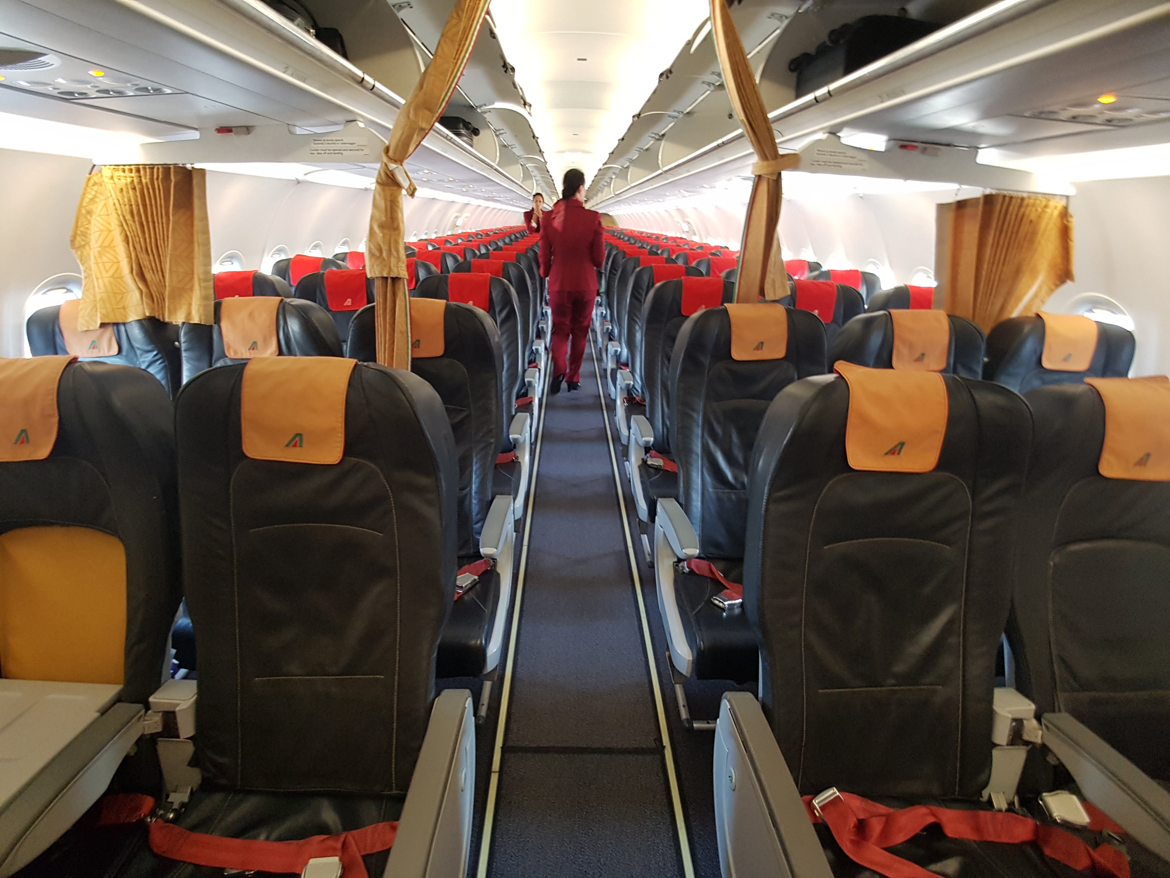 Tym razem nasz lot miał odbyć się na pokładzie Airbusa A320-200 Alitalii, który powoli dobiega swoich dziesiątych urodzin. Klasa biznes na dzisiejszym locie to zaledwie dwa pierwsze rzędy, jak wcześniej oddzielone zasłonką od pozostałej części kabiny. Siedzenia to tradycyjnie fotele identyczne z tymi w klasie ekonomicznej, z zablokowanym środkowym fotelem, w którym wypuszczono dodatkowy stolik. Tym razem z przodu samolotu podróżować będzie czwórka pasażerów.