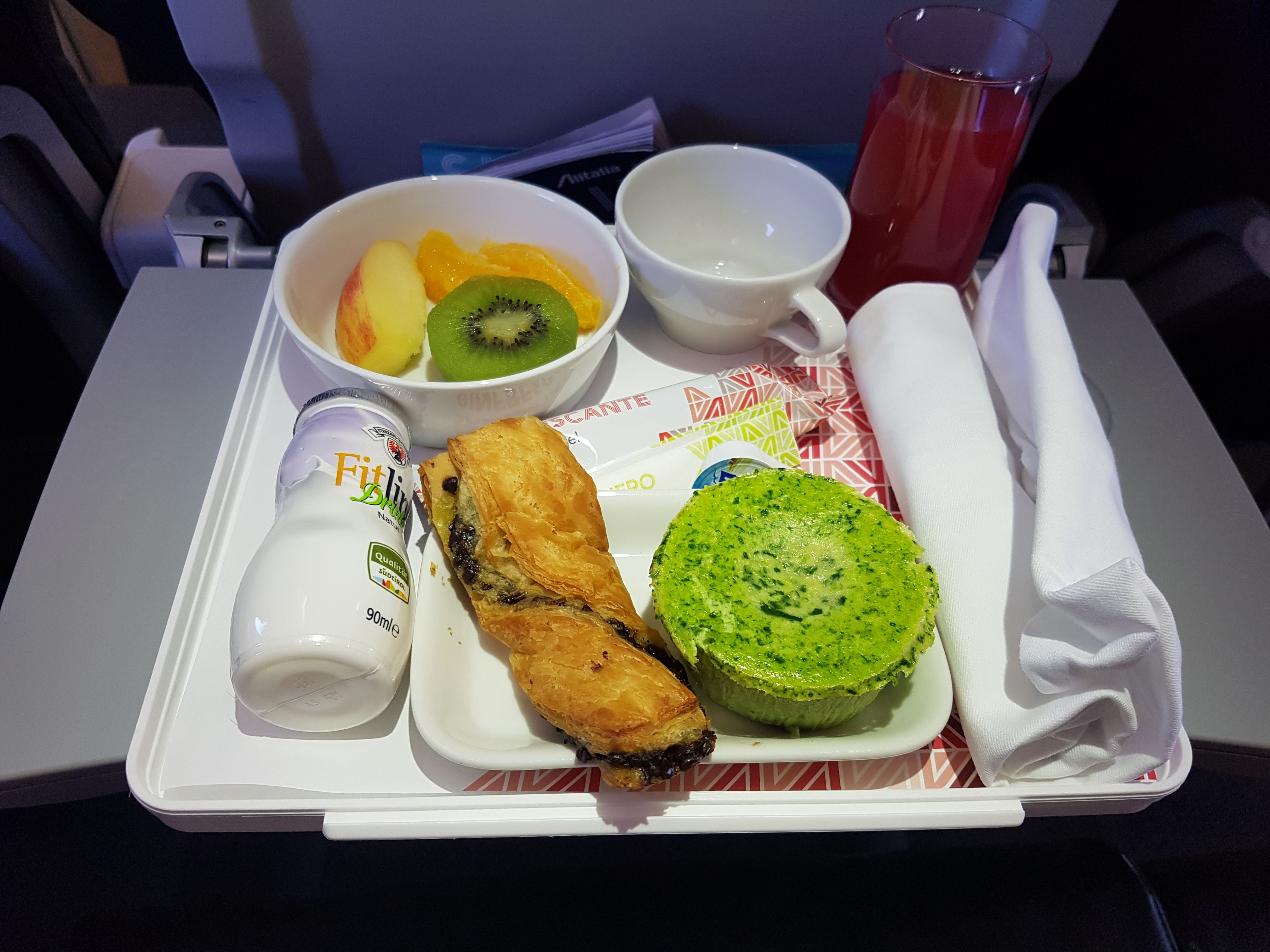 Wróćmy jednak na chwilę do podanego posiłku. Składa się on z buteleczki jogurtu pitnego, porcji owoców, oraz podanych na jednym talerzyku – słodkiego wypieku z czekoladą, oraz czegoś, co przypomina rodzaj sufletu z, jak nam się wydaje, szpinakiem. Danie to jest całkowicie niejadalne, więc trudno nam powiedzieć na jego temat coś więcej – po prostu nie nadawało się do spożycia (podano je w temperaturze pokojowej). Do picia podano sok z czerwonych pomarańczy. Herbatę z dzbanka do filiżanki, stanowiącej część kompletu śniadaniowego podano bardzo szybko.