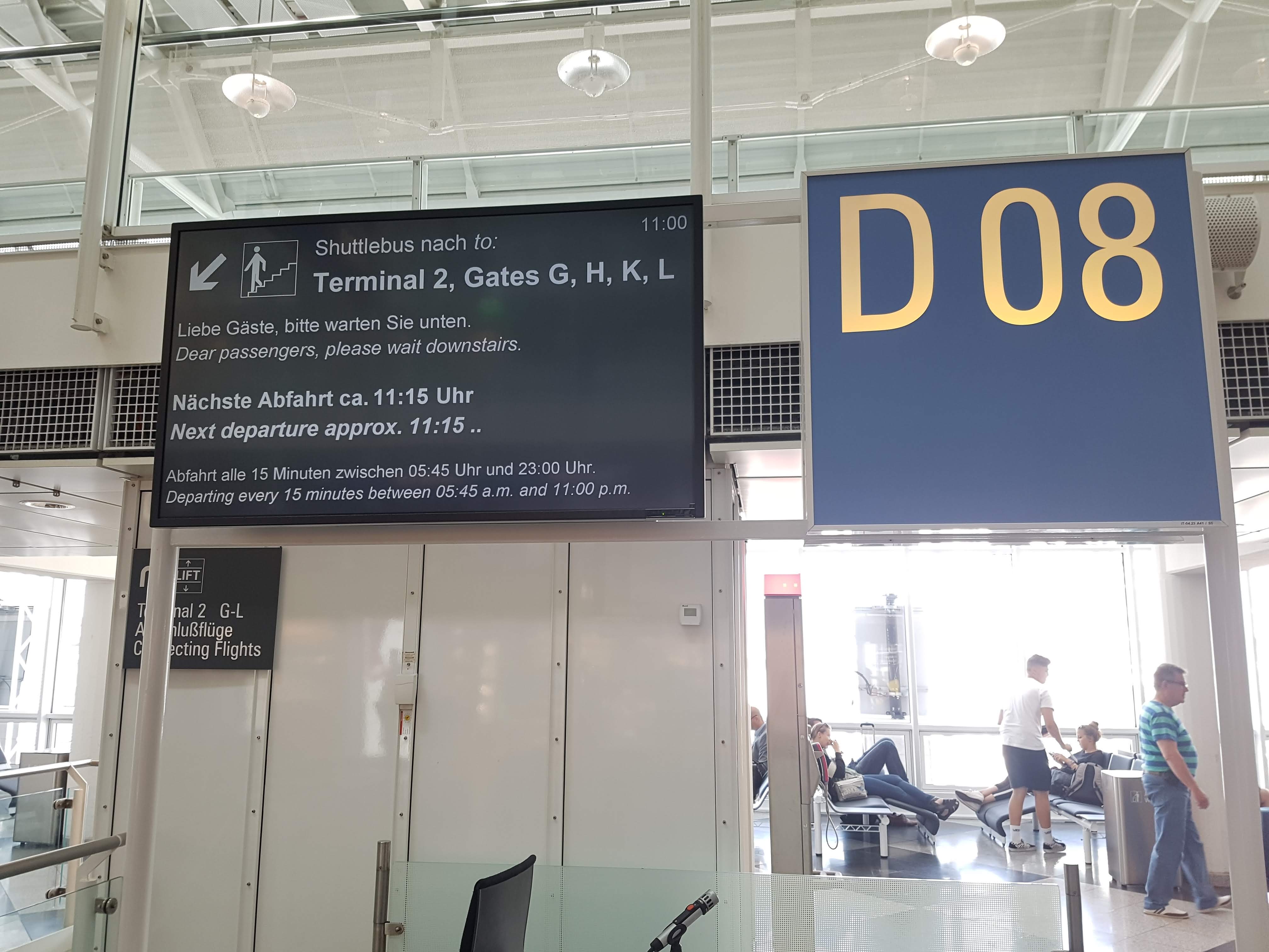 Po wyjściu z samolotu, chcąc uniknąć powtórnej kontroli bezpieczeństwa, postanowiliśmy udać się do terminala T2 monachijskiego lotniska korzystając z transportu wewnętrznego po stronie sterylnej. Droga do autobusu, który kursuje na tej trasie co kwadrans była tą samą trasą, którą musielibyśmy przebyć, aby udać się do saloniku biznesowego KLM/Air France, jeśli chcielibyśmy z niego skorzystać przed poprzednim lotem. Czas wymagany na pokonanie tej trasy, uwzględniając w tym kolejki, zatory w stosunkowo wąskim korytarzu i inne przeszkody, to około 20 minut w jedną stronę.