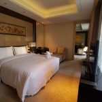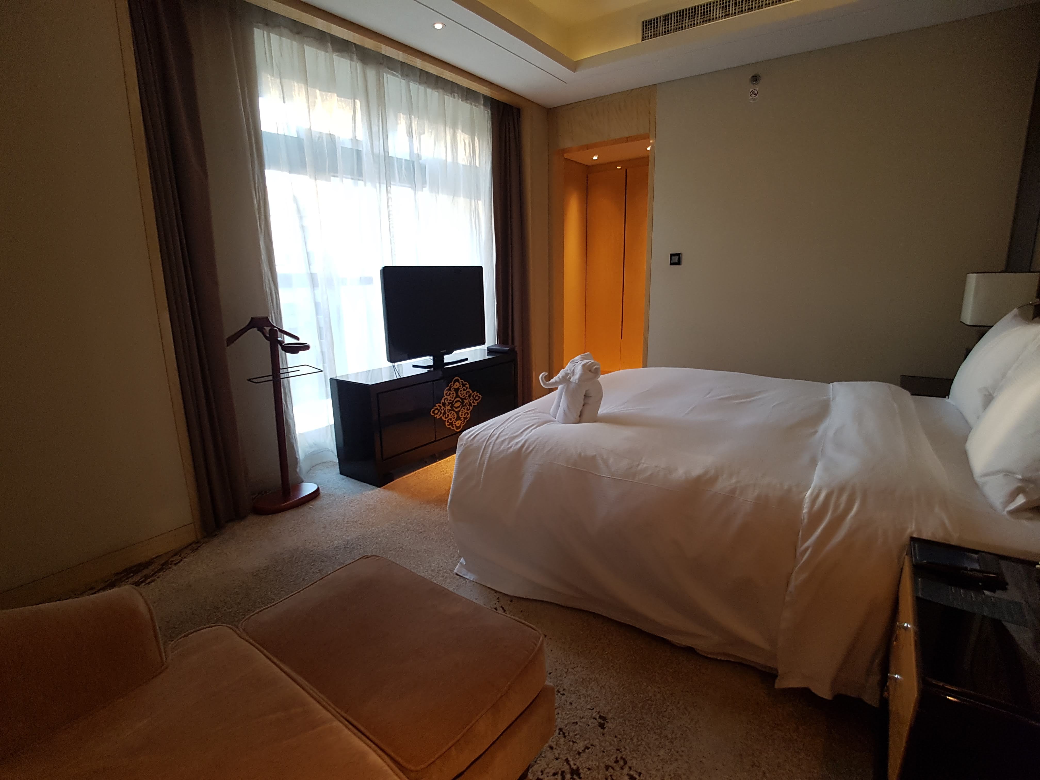 Przestronna sypialnia z wielkim łóżkiem, fotelem z otomaną, tworzącymi w komplecie niemal szezlong, przywitała nas wymyślnie zwiniętym ręcznikiem, uformowanym na kształt słonia – rzecz, którą często spotkać można w azjatyckich kurortach wypoczynkowych, ale pierwszy raz widzianą przez nas w Chinach. Sypialnia jest wielka, łóżko ustawiono vis-a-vis sporego okna, w świetle którego ustawiono sporych rozmiarów telewizor. Szafki nocne po obu stronach łóżka wyposażone były w dodatkowe gniazdka elektryczne, umożliwiające bezproblemowe ładowanie gadgetów podczas wypoczynku. Potrzebowaliśmy tylko własny adapter do prądu i już mogliśmy podłączyć elektronikę do gniazdek.