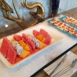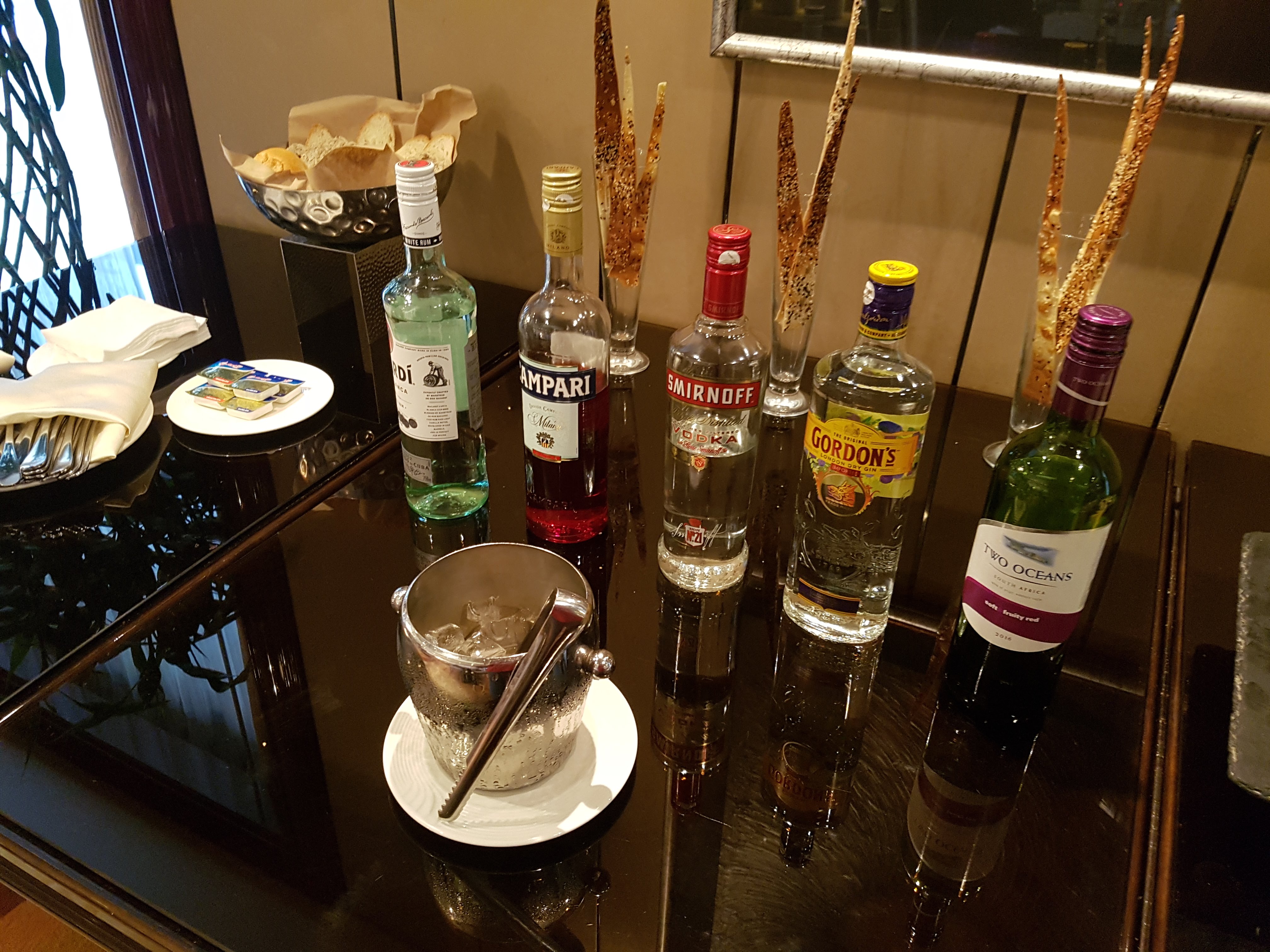 Po powrocie do hotelu odpoczęliśmy chwilę, po czym zaczęliśmy przygotowywać się do wyjazdu. W międzyczasie postanowiliśmy ponownie odwiedzić executive lounge i zobaczyć, co oferuje podczas tak zwanych happy hours, czyli wieczornego serwisu. Do dyspozycji gości, których zgromadziło się nieco więcej niż w czasie śniadania, oddano dania ciepłe (krewetki, różne rodzaje mięs, bułeczki na parze, trzy rodzaje miso z dodatkami, sajgonki i temu podobne), owoce, warzywa, sałatki, kilka rodzajów kanapek, sery. Oferta napojów została poszerzona o piwa, wina i alkohole mocniejsze (wódka, gin, rum, campari).