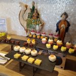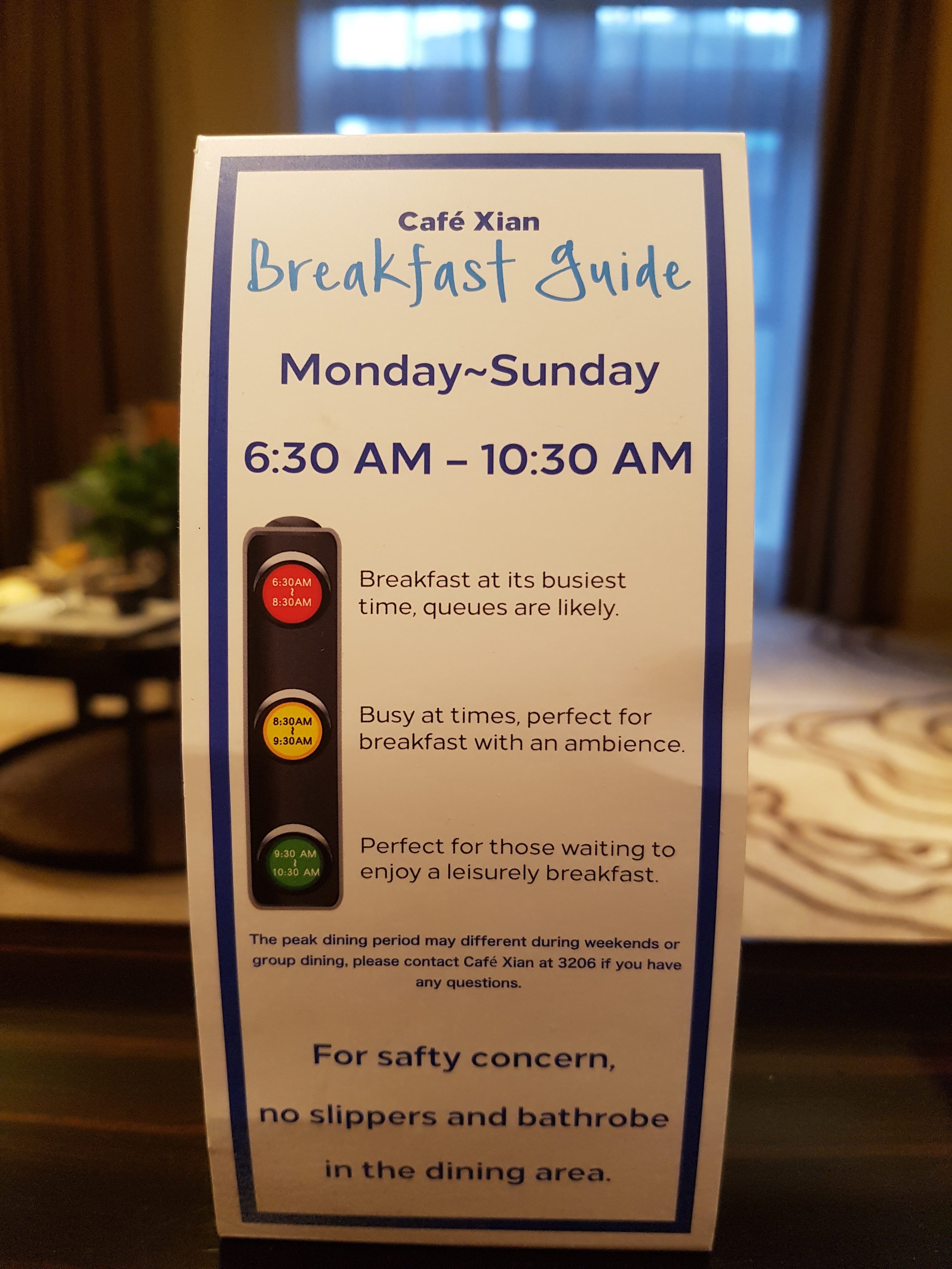 Oferta saloniku w porze śniadaniowej składała się z dań ciepłych stanowiących mieszankę kuchni europejskiej i azjatyckiej (kiełbaski gotowane, bekon, fasolka w sosie pomidorowym, ale także pierożki na parze, congee, ryż) oraz dań zimnych, takich jak płatki śniadaniowe, sery, wędliny, ryby, pieczywo, owoce, warzywa, oraz słodkości. Nie mogło zabraknąć również kawy i herbaty, a także wody oraz soków.