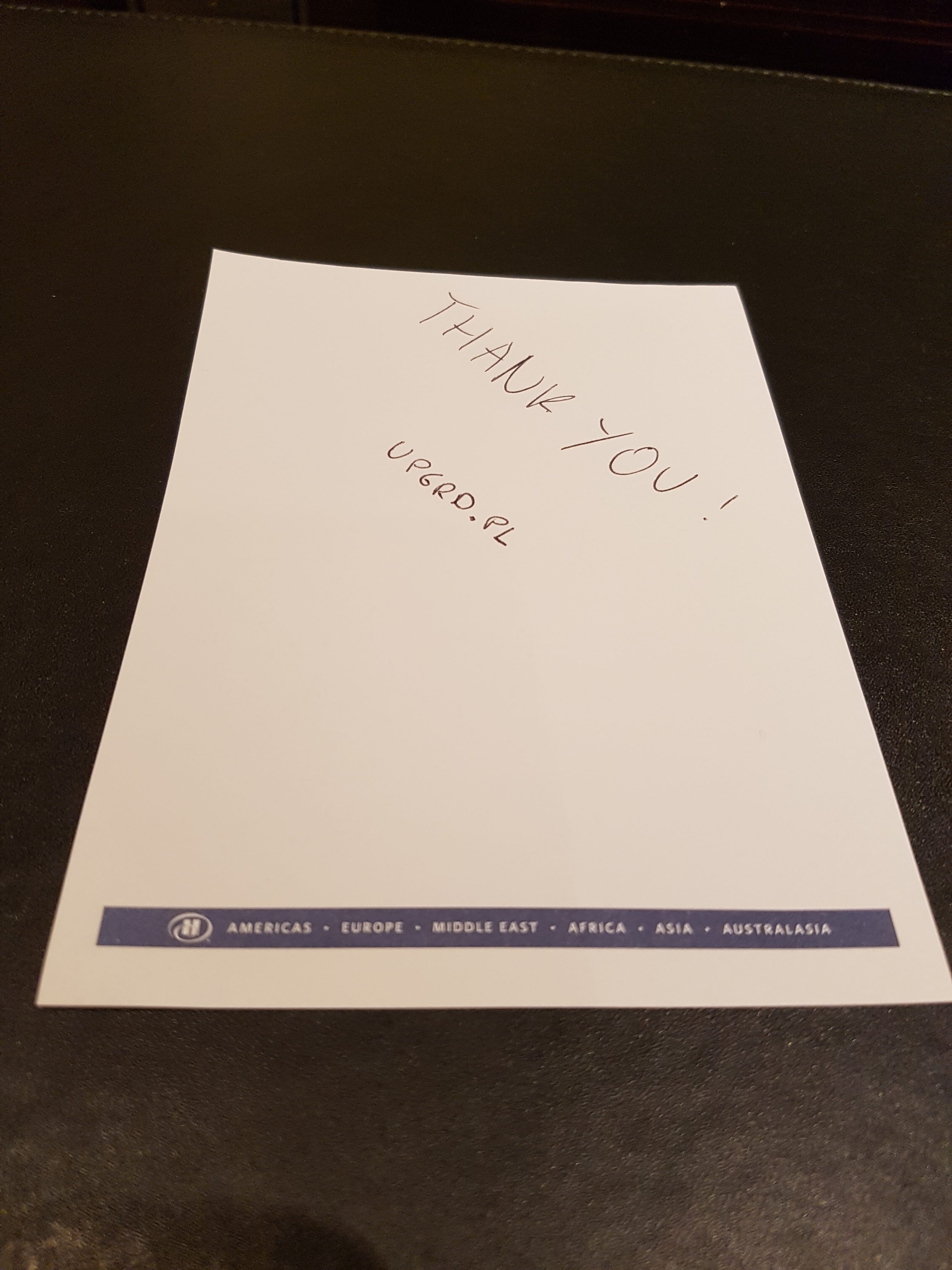 Po powrocie do hotelu, na stoliku kawowym w salonie zastaliśmy liścik i wstawkę powitalną od hotelu. To bardzo miły gest. Szczególnie ucieszył nas liścik, który mogliśmy zrozumieć, bo napisany był w języku angielskim. Kartka z wiadomością, którą zastaliśmy obok butelek wody, na barku kiedy po raz pierwszy weszliśmy do pokoju, do dziś pozostaje dla nas tajemnicą – mimo prób tłumaczenia za pomocą odpowiednich funkcji google translate i tak nie wszystko zrozumieliśmy.