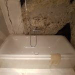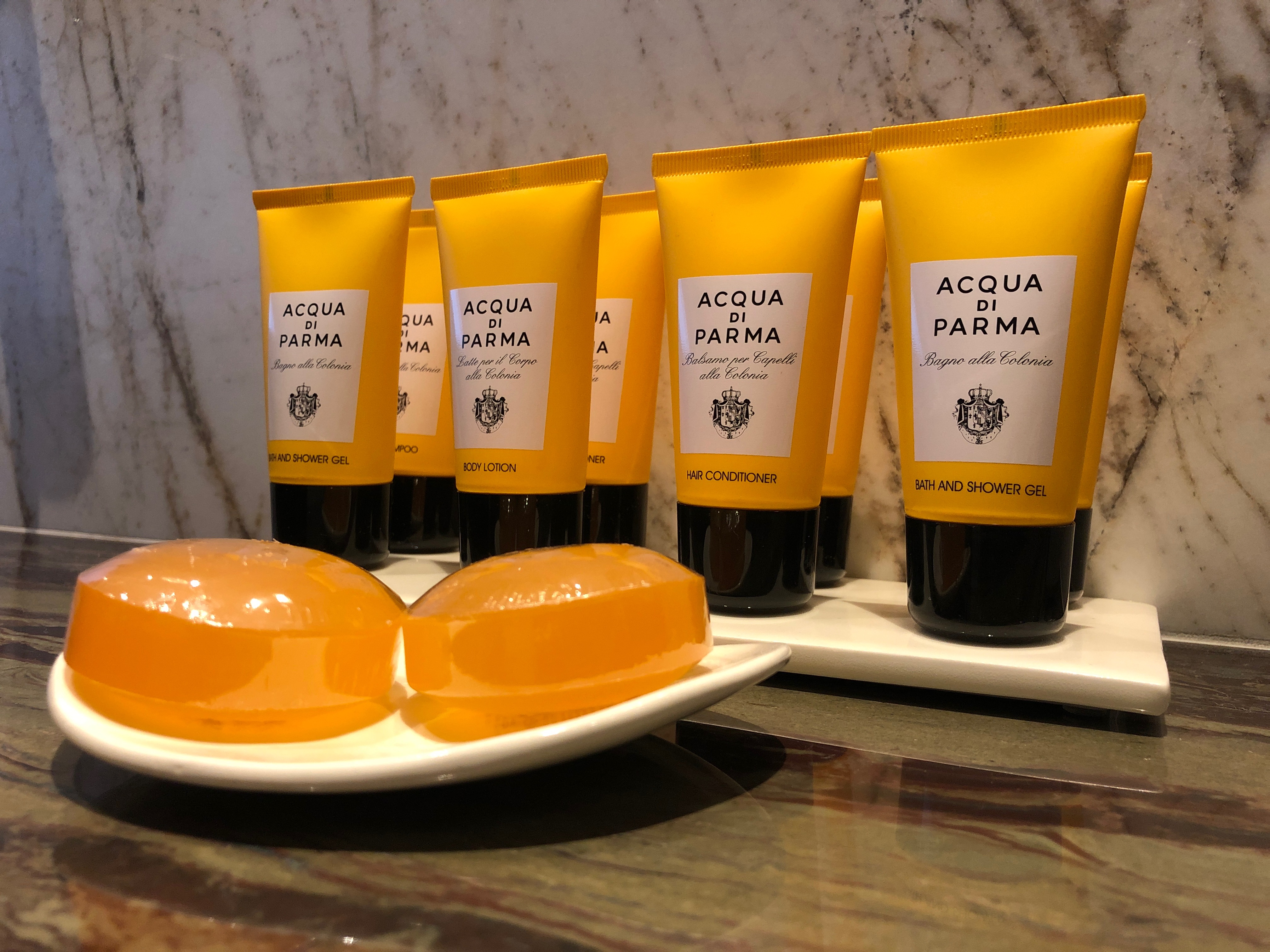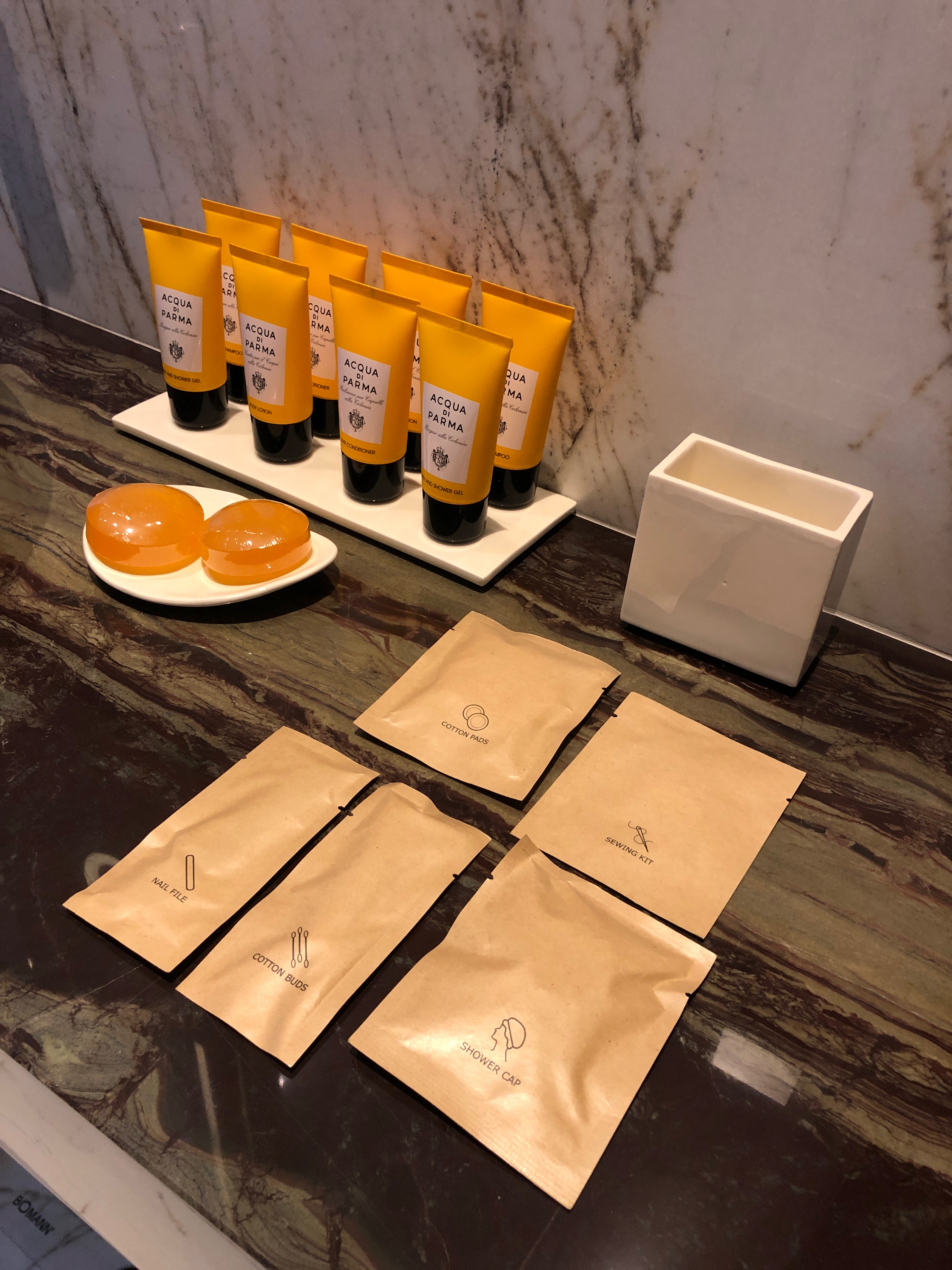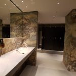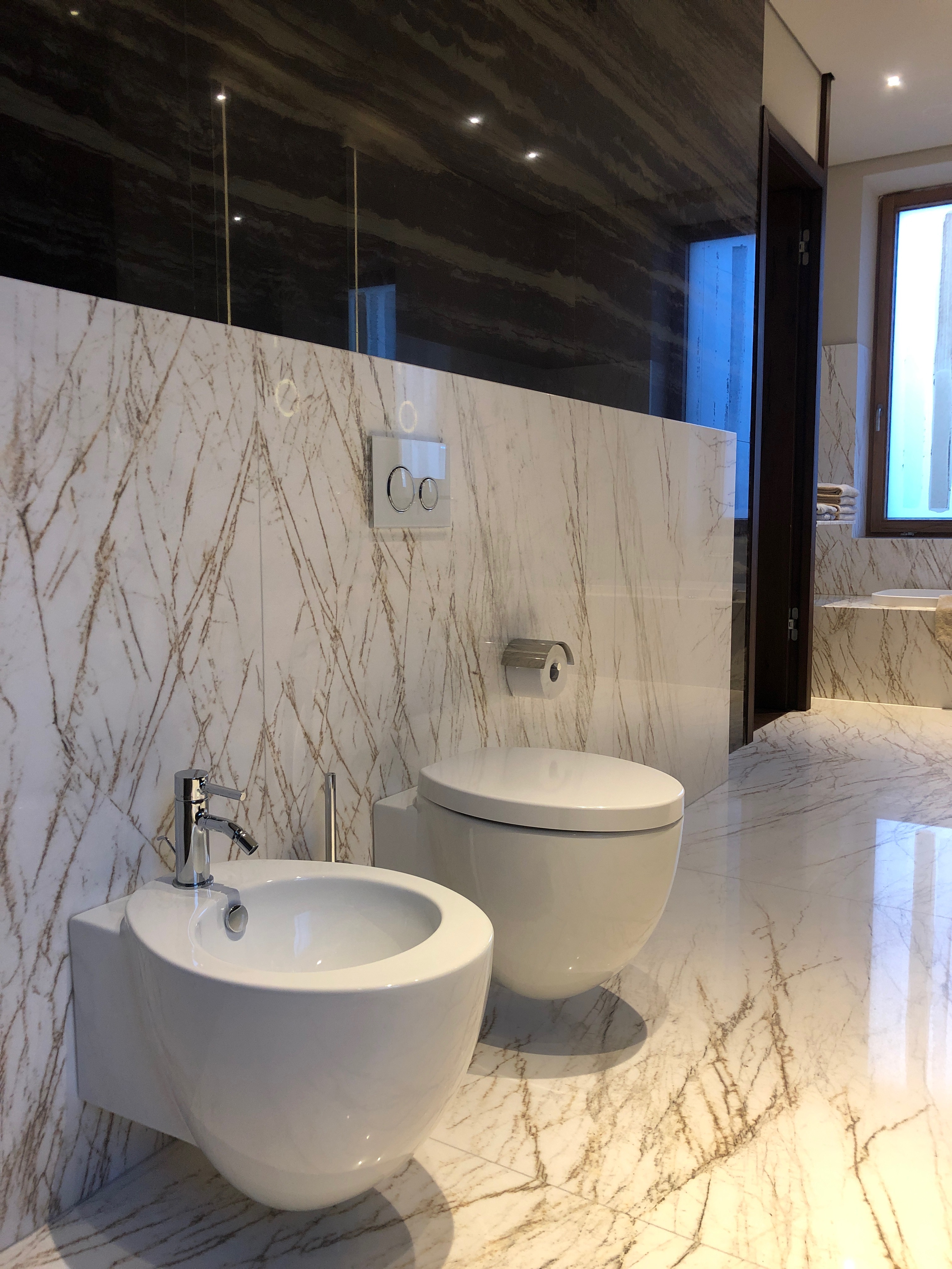 Pozostałą część pokoju stanowi pokaźnych rozmiarów łazienka, pełniąca również rolę toalety. Jedno wspólne pomieszczenie zawiera w sobie wszystko co w takim miejscu niezbędne. Jest więc duża wanna z hydromasażem, zabudowana w okolicy okna. Pokaźnych rozmiarów okno z mlecznego szkła, z wielką, na całą jego powierzchnię, ilustracją przypominającą logo hotelu, stanowi źródło światła dziennego dla całego pomieszczenia. Duży blat z dwoma umywalkami, nad którymi dominują wielkie lustra z wbudowanymi lusterkami powiększającymi. Nieco dalej znajduje się toaleta, oraz bidet, na drugiej ścianie zaś prysznic typu walk-in, vis-a-vis którego znajduje się kolejne okno. Cała łazienka wykonana jest z kilku rodzajów kamienia, które współgrają ze sobą i wzajemnie się uzupełniają.